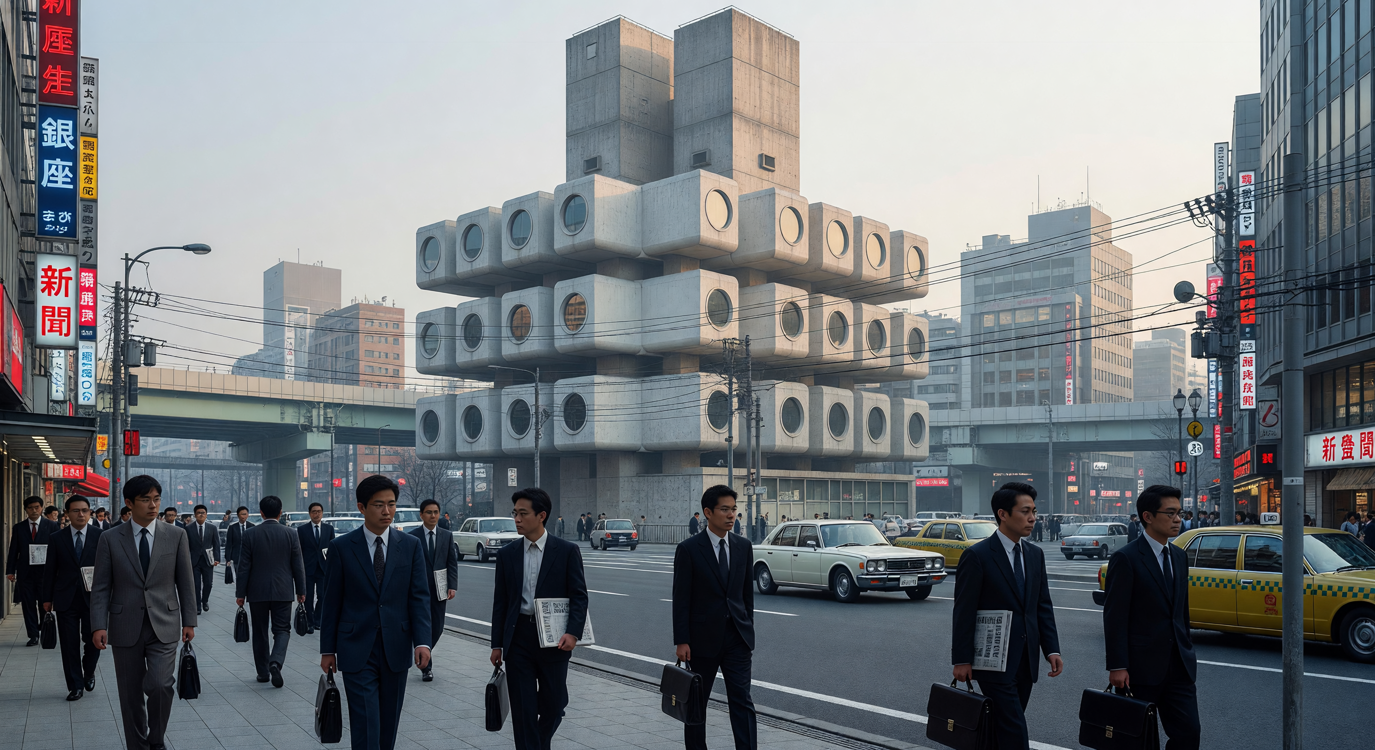 1972 की एक धुंध भरी सुबह में, टोक्यो के गिन्ज़ा जिले में स्थित नकागिन कैप्सूल टॉवर अपनी भविष्यवादी और मेटाबॉलिस्ट वास्तुकला के साथ खड़ा है, जिसमें गोलाकार खिड़कियों वाले सफेद कंक्रीट के मॉड्यूल एक केंद्रीय स्तंभ से जुड़े हुए हैं। सड़कों पर गहरे रंग के सूट पहने 'सैलरीमेन' और क्लासिक टोयोटा सेडान कारें जापान के तीव्र शहरीकरण और युद्ध के बाद के आर्थिक उत्थान की झलक पेश करती हैं। किशो कुरोकावा द्वारा डिजाइन किया गया यह ऐतिहासिक ढांचा 'मेटाबॉलिज्म' आंदोलन का प्रतीक था, जो बदलती शहरी जरूरतों के अनुसार इमारतों को जैविक रूप से विकसित और नवीनीकृत करने की परिकल्पना करता था।
