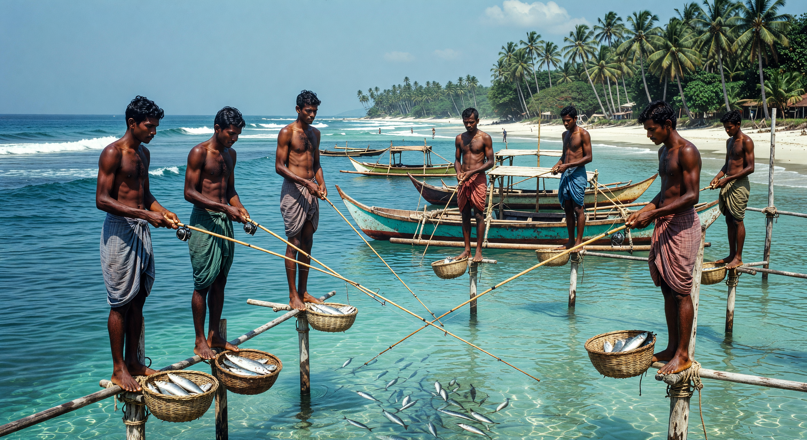 - 한국어: 웰리가마 해안의 전통 장대 낚시꾼들