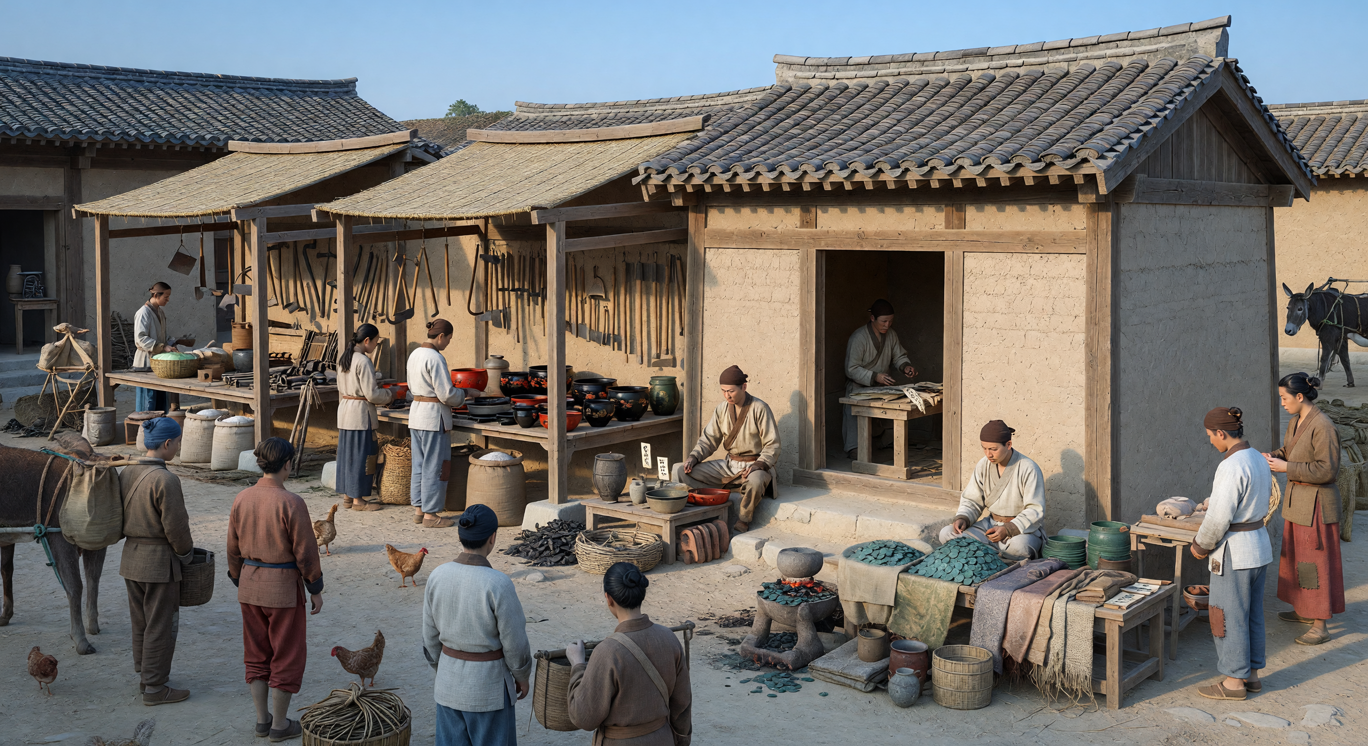 शीर्षक/कैप्शन हान वाणिज्य के संबंध में तथ्यात्मक रूप से सुदृढ़ है: 200 ईसा पूर्व के बाद लौह औज़ार व्यापक हुए, नमक एक प्रमुख वस्तु था, हान कार्यशालाओं में लाख-उद्योग फला-फूला, कपड़ा-वाणिज्य बढ़ा, छिन–हान निरंतरता के अंतर्गत राज्य ने भार और माप का मानकीकरण किया, और दूसरी शताब्दी ईसा पूर्व में शहरी बाजारों ने क्षेत्रों को जोड़ते हुए विस्तार किया। तथापि, ‘प्रारम्भिक पश्चिमी हान’ का मेल ‘वू झू सिक्कों’ से नहीं बैठता (लगभग 206–118 ईसा पूर्व तक बानलियांग प्रमुख था; वू झू 118 ईसा पूर्व में सम्राट वू के अधीन, मध्य पश्चिमी हान में प्रारम्भ हुआ)। ‘कुटी-मिट्टी से घिरा नगर’ और ‘आधिकारिक कार्यालय तथा टकसाल क्षेत्र’ दृश्य में वास्तव में जो दिखता है उससे अधिक दावा करते हैं—न तो कोई प्राचीर दिखाई देती है, न ही कोई विशिष्ट टकसाल (हान टकसालें केंद्रीकृत थीं, सड़क-समीप नहीं)। ‘कांस्य वू झू सिक्कों की लड़ियाँ’ उपयुक्त हो सकती हैं यदि तिथि-निर्धारण आगे का किया जाए, पर सटीकता हेतु वाक्य-विन्यास समायोजित होना चाहिए। साम्राज्यिक नेटवर्कों पर दिया गया संदर्भ ठोस है; छोटे संशोधन पर्याप्त हैं।