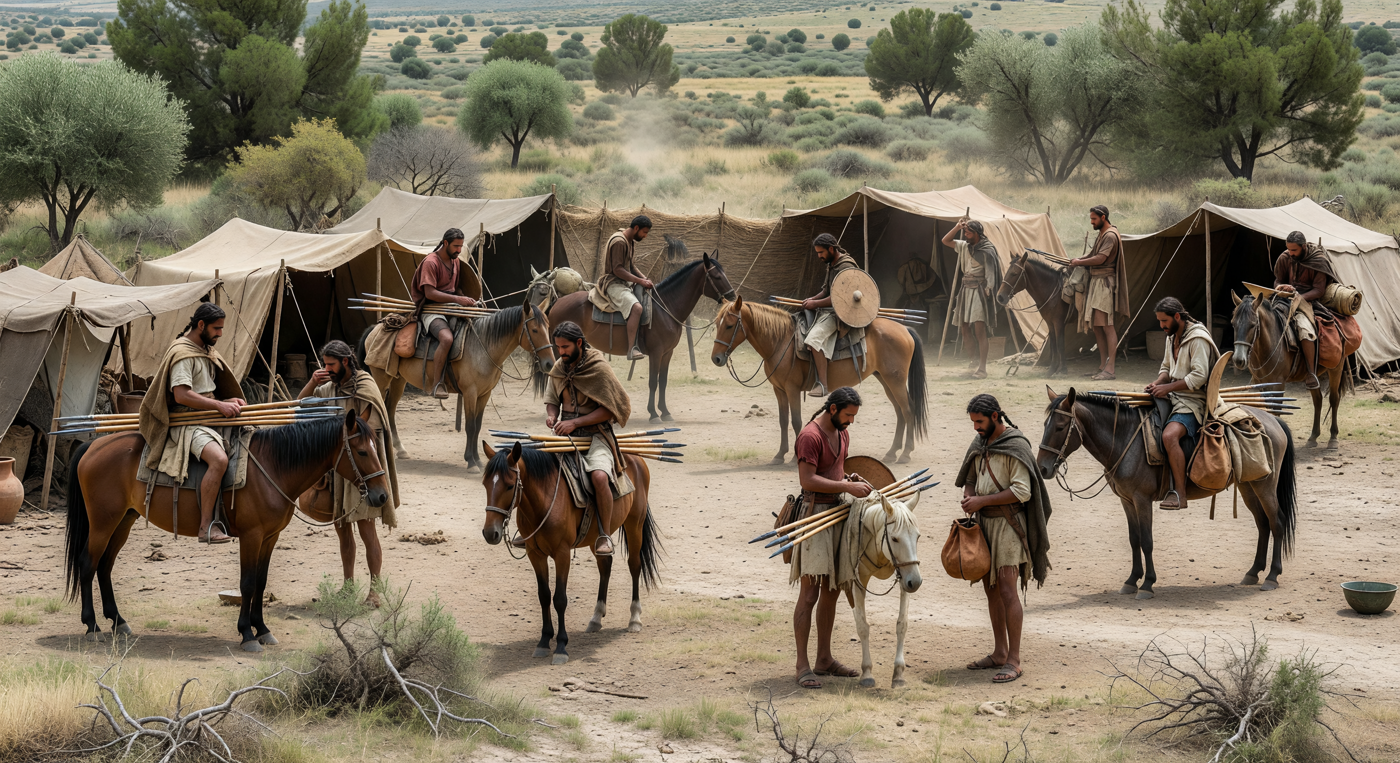 यह छवि उत्तर अफ्रीकी स्टेपी के मूल वातावरण और नुमिडियनों के विशिष्ट उपकरणों—जैसे भालों के गट्ठर और छोटे, सहनशील घोड़ों—को प्रभावी रूप से दर्शाती है। तथापि, यह इस संस्कृति की एक प्रमुख निदानात्मक विशेषता पर विफल होती है: अश्व-साज। नुमिडियन घुड़सवार प्रसिद्ध रूप से ‘बिना लगाम’ होते थे, जो अपनी सवारी को गर्दन की रस्सी या एक छड़ी की सहायता से नियंत्रित करते थे, जबकि छवि में आधुनिक शैली की लगामें और बिट दिखाई गई हैं। इसके अतिरिक्त, तंबू 19वीं सदी के कैनवस रिज तंबुओं जैसे प्रतीत होते हैं, न कि उन ‘mapalia’ के समान (बुनी हुई चटाइयों या खालों से बने नीची, लंबी झोपड़ियाँ) जिनका वर्णन सलस्ट जैसे प्राचीन स्रोतों में मिलता है। शैक्षिक परियोजना में ऐतिहासिक शुद्धता के लिए ये तत्व अत्यंत महत्त्वपूर्ण हैं और इनमें शीघ्र सुधार आवश्यक है।