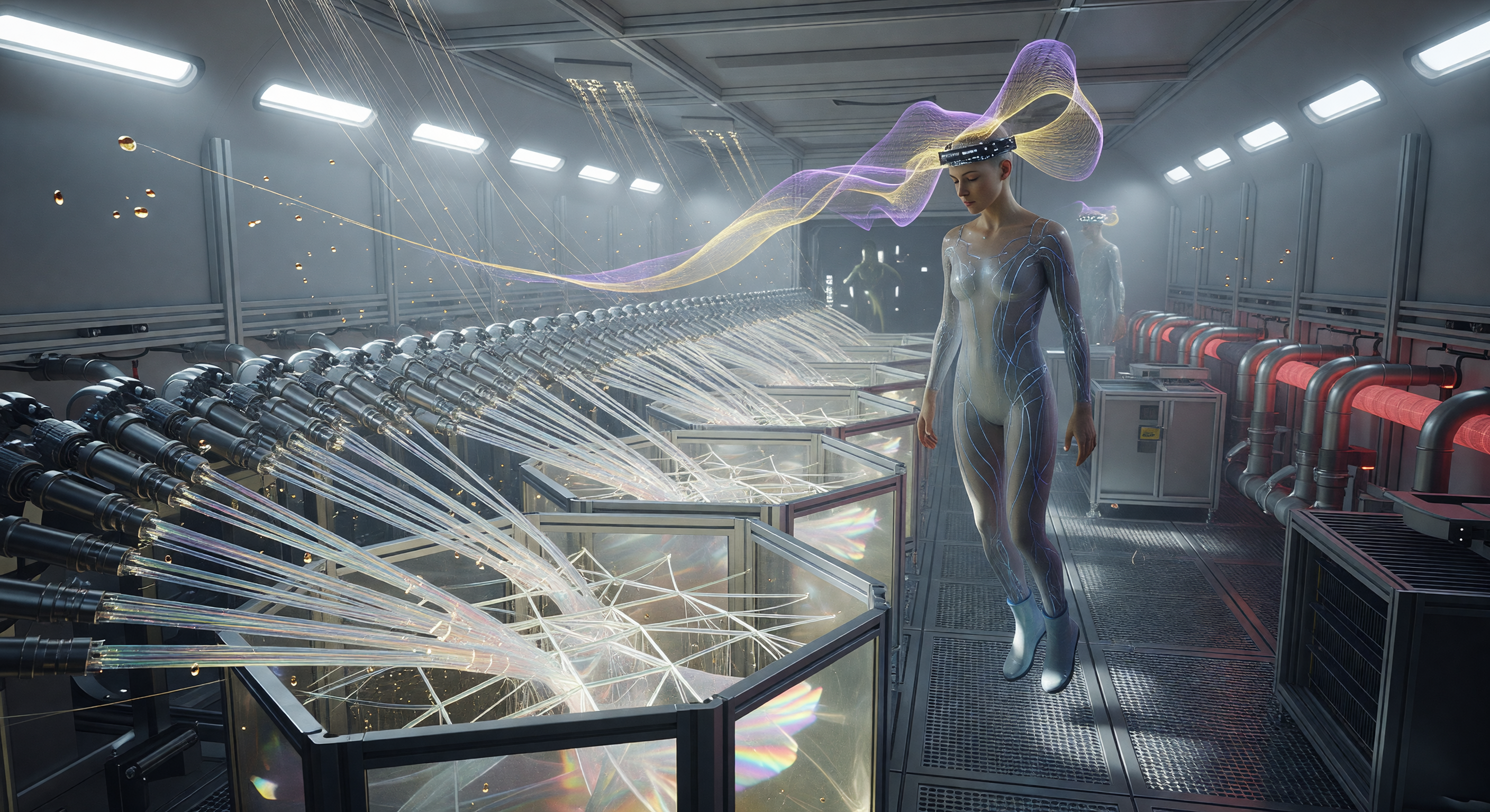 सौर विस्तार युग (2500-3000 ईस्वी) के दौरान, डायसन स्वार्म के एक सूक्ष्म-गुरुत्वाकर्षण कक्ष में आणविक असेंबलर 'वैट-सिल्क' नामक पोषक प्रोटीन की जटिल परतें बुनते हुए दिखाई दे रहे हैं। यहाँ एक 'कार्बन-बेसलाइन' तकनीशियन न्यूरल-इंटरफेस के माध्यम से फोटोनिक ऊर्जा प्रवाह की निगरानी कर रहा है, जो आंतरिक सौर मंडल के इस औद्योगिक वातावरण में जीवन के लिए आवश्यक पोषण सुनिश्चित करता है। यह दृश्य कार्दाशेव 1.9 श्रेणी की उस उन्नत सभ्यता को दर्शाता है जिसने तारों की ऊर्जा और नैनो-तकनीक के मेल से अंतरिक्ष की निर्वात शून्यता में भी जैविक अस्तित्व को संभव बनाया है।