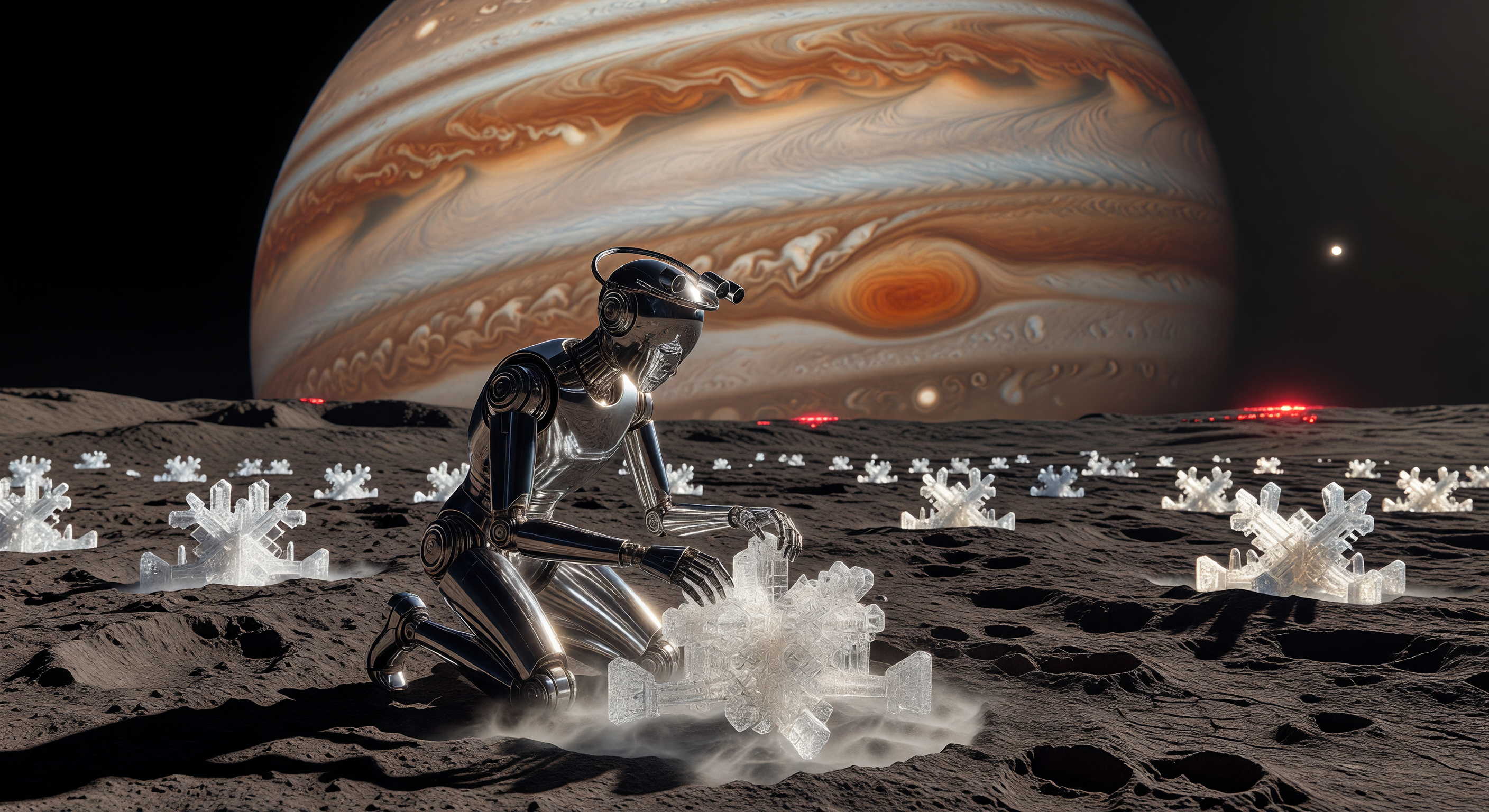The image effectively captures Callisto's dark, heavily cratered regolith surface with its characteristic dusty, icy-gray appearance, which is scientifically accurate based on Galileo and Juno mission data showing a water-ice dominant crust mixed with dark phyllosilicates and organics. Jupiter looms appropriately large in the background (subtending ~6-8° from Callisto's orbit), with accurate banded cloud features and a reddish spot evoking the Great Red Spot; the amber hue is plausible under future artistic lighting or enhanced atmospheric scattering. The fractal 'snowflake' sculptures resemble volatile ice crystals (likely water ice, given sublimation mist effects), fitting a speculative art installation, and the red 'Heat-Wings' glows match distant crimson vents. However, the robot is a bipedal humanoid with only two visible arms, contradicting the caption's 'multi-limbed' description—a clear mismatch requiring prompt adjustment for additional manipulators. No major anachronisms; tech is coherently futuristic for 250-300 CE, with visual plausibility enhanced by vacuum dust effects and starry void. Minor issues like exaggerated lighting glows are artistically forgivable but could be refined for stricter realism.