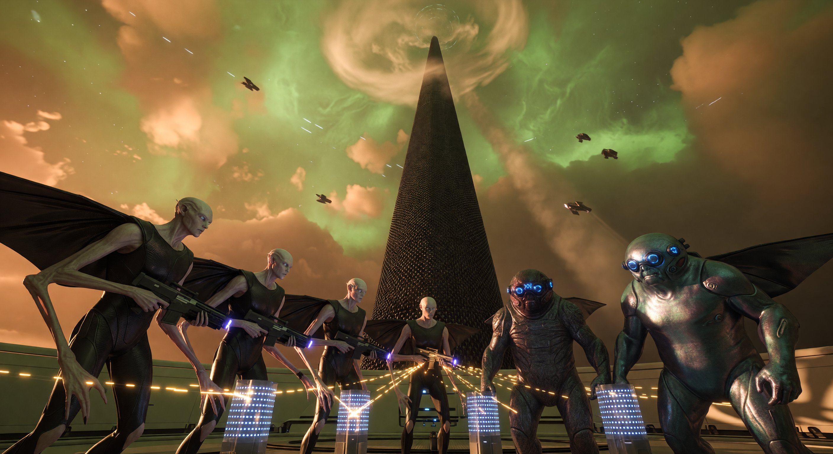 Image issues identified by any reviewer: 1) The habitat lacks a visible aerostat envelope, buoyant structure, or rigging, so it can look like a flat platform or even a surface installation rather than a structure floating 50 km above Venus. 2) The space-elevator / carbon-nanotube tether is ambiguous in geometry and scale; the central spire can be read as a generic obelisk rather than an unmistakable elevator cable base. 3) The platform does not clearly show tension cables, structural anchoring, or other scale cues that would communicate a true elevator base. 4) The scene does not clearly show high-altitude suspension in a dense cloud deck; it risks reading as a vacuum or generic sky setting instead of Venus’s atmosphere. 5) The Venice/Venus cloud context is only implied; the exact lime-green coloring is artistically effective but not scientifically anchored. 6) The Aeros are depicted with wings and slender builds, which fits the captioned faction, but the image does not clearly verify the more specific adaptation claims like hollow bones or enhanced pulmonary systems. 7) The Lithomorphs have metallic/iridescent bodies, but the image does not explicitly confirm sub-dermal lead-bismuth shielding or radiation-hard inner-solar-system physiology. 8) Any apparent combat effects and flying craft are generic sci-fi elements and not uniquely tied to the Venus/Mercury setting.