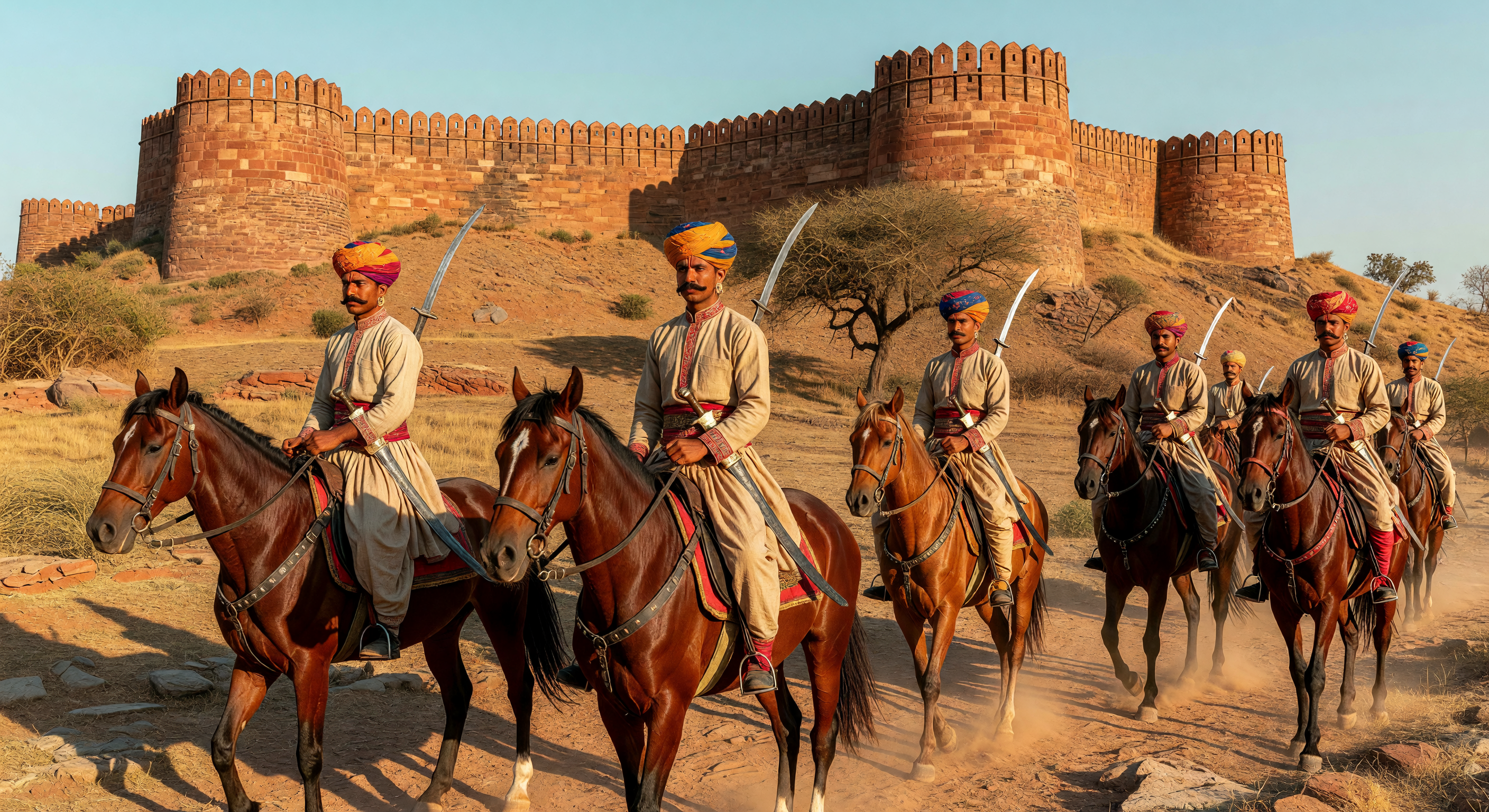 The committee agrees that the scene is broadly consistent with a Rajput hill-fort setting in the arid South Asian landscape: the red sandstone fort, crenellated battlements, rounded bastions, sparse scrubby vegetation, mounted warriors, colorful turbans, and overall desert atmosphere are all visually plausible. The curved swords also generally fit the talwar idea, and the horses read as indigenous desert cavalry mounts at a general level.