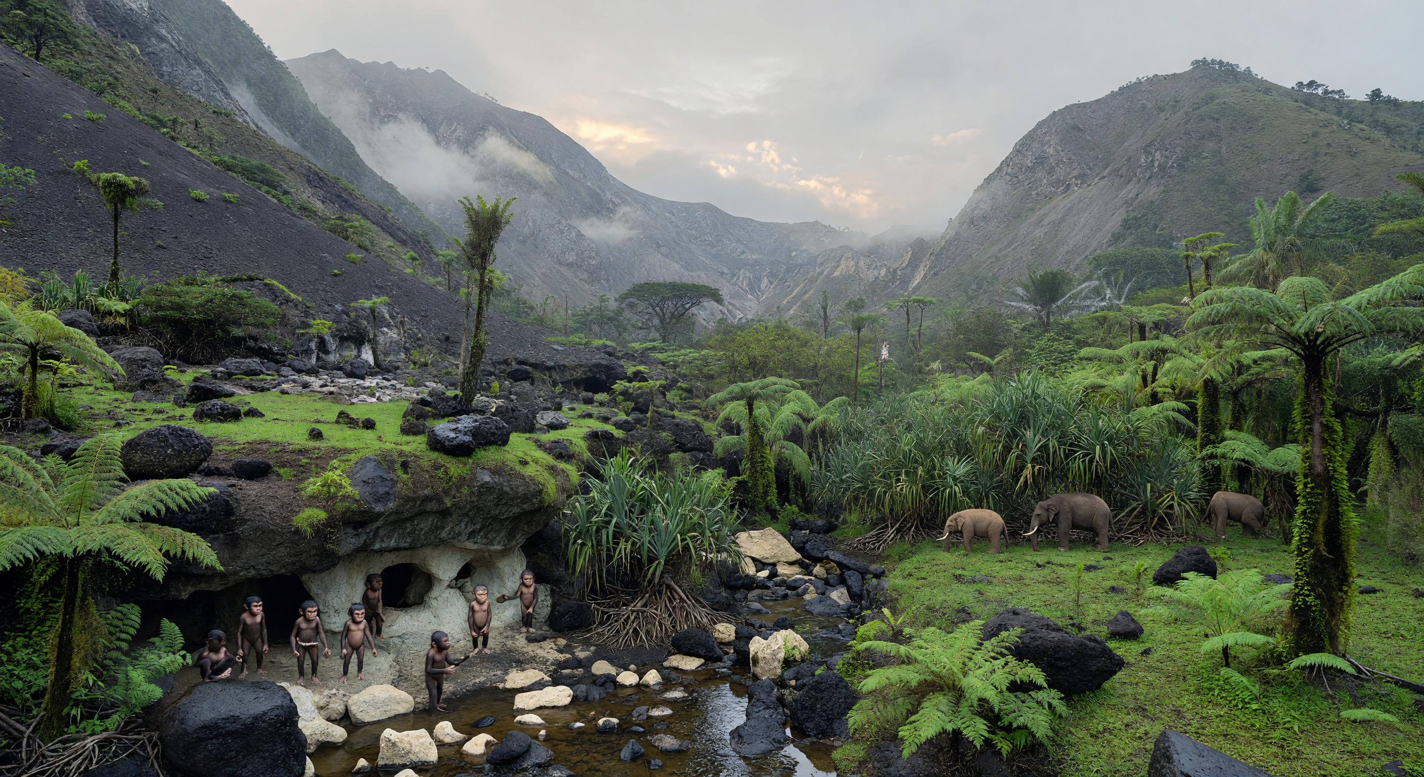 - Español: Homo floresiensis y Stegodon en el valle volcánico de Flores