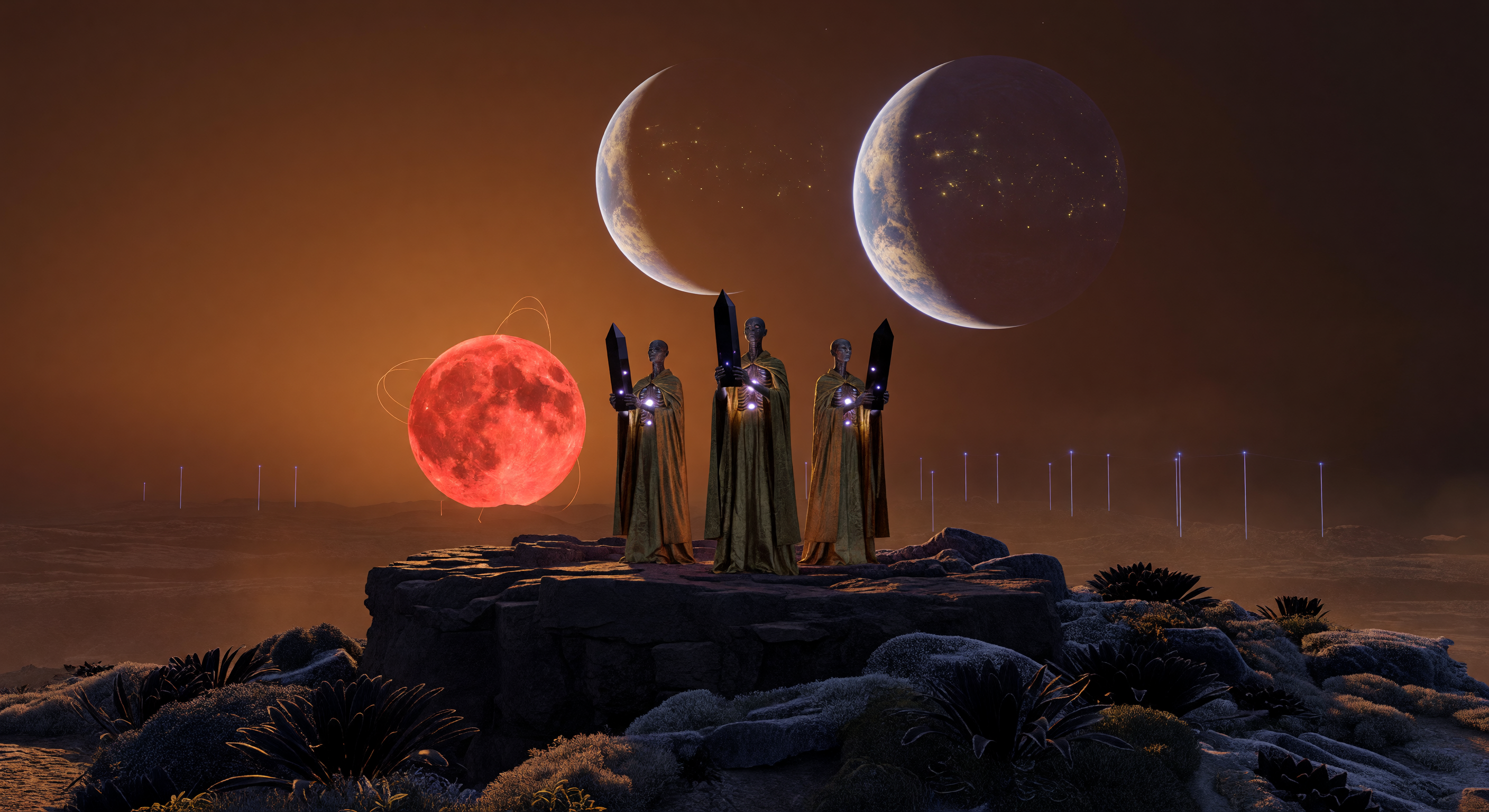 Paragraph 1: The committee agrees the image is visually coherent and strongly evokes a speculative alien exoplanet ritual scene: three robed figures, dark prismatic objects, a red/orange sky, rocky terrain, and multiple celestial bodies all support the intended atmosphere. Several reviewers also found the overall lighting and ceremonial composition effective for an Interstellar Dawn setting.