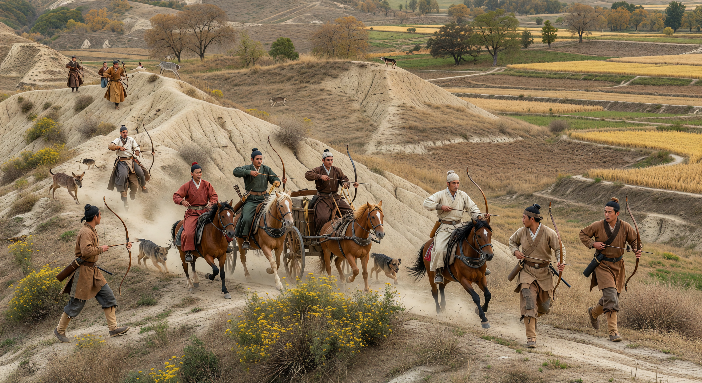 A Zhou aristocratic hunting party crosses the dry loess hills of northern China in the Spring and Autumn period, around 650–500 BC, with a light two-horse chariot, saddleless riding horses, and foot archers pursuing a sika deer through scrub, woodland patches, and terraced millet fields. The figures’ belted cross-collared robes, simple leather footwear, composite bows, and bronze-fitted harness reflect the material culture of Eastern Zhou elites, when chariots still signaled rank even as more mobile hunting and warfare were adapting to rougher terrain. Set in the semi-arid Yellow River basin, the scene evokes the seasonal rhythms, aristocratic pastimes, and mixed agricultural frontier landscape of early Iron Age North China.
