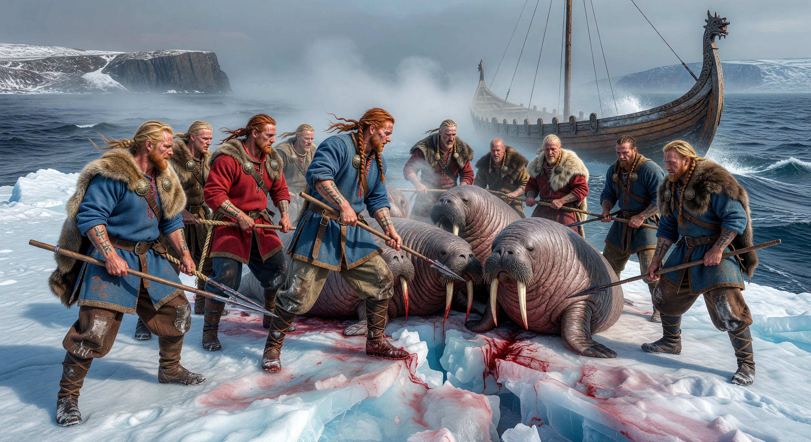The image effectively captures a dramatic Norse walrus hunt on North Atlantic pack ice, with walruses accurately depicted anatomically (correct tusk morphology, pinkish skin tones on disturbed animals, blood pooling realistically on ice). The clinker-built longship with dragon prow in the background is spot-on for 10th-century Scandinavian technology, including the single square sail and oar configuration amid stormy seas and distant rocky cliffs, evoking plausible Svalbard/Jan Mayen-like geology. Clothing layers of wool tunics, trousers, hoods, and furs align with archaeological finds from Viking sites, and the iron-tipped spears/harpoons resemble period weapons like those from Gokstad ship burials. However, adjustments are needed for the prominent geometric tattoos on exposed arms, which echo modern Viking revival aesthetics rather than sparse archaeological evidence of Norse tattooing (e.g., limited saga mentions, no confirmed designs); the oversized brooches and beaded necklaces feel ceremonial rather than practical for blood-soaked ice work; and the overcrowding of 8-10 men on a small floe near breaking ice and open water strains logistical plausibility, as Norse hunts favored smaller crews on more stable haul-outs or from boats to avoid capsize risks.