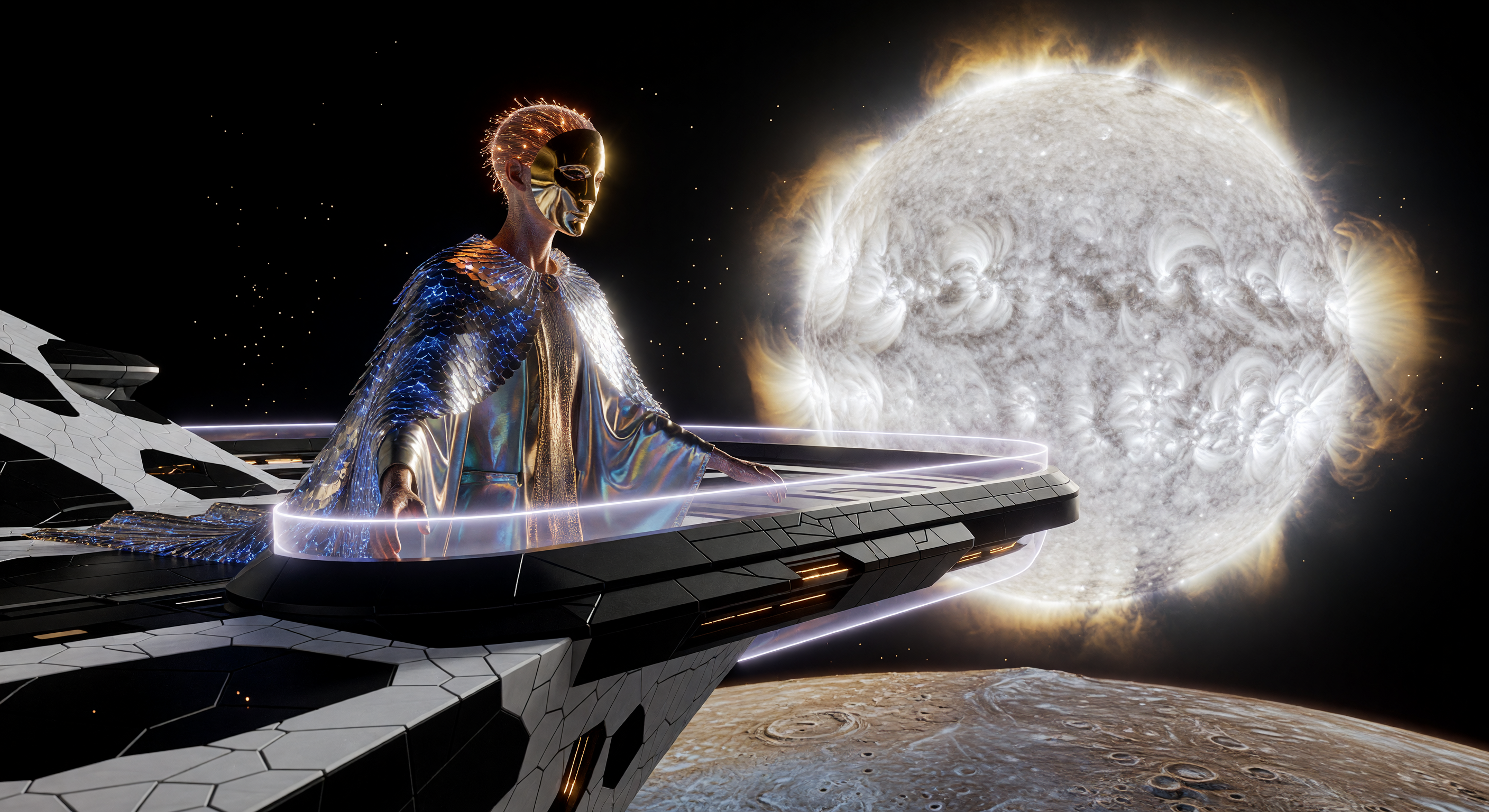 The image effectively captures a speculative futuristic aesthetic for the Solar Expansion era (250–300 CE) in the Fashion, Arts & Culture zone, with a humanoid figure in iridescent, flowing robes/cape on a sleek, angular metallic platform amid a starry void, Mercury's gray cratered surface visible below, and a dramatically oversized, glowing Sun dominating the background. The cape’s shimmering, scale-like texture visually suggests photovoltaic smart-matter, and the glowing blue energy ring around the platform plausibly evokes a magnetic containment field. The Sun's rendering as a brilliant white disk with orange prominences is artistically coherent, though scientifically the Sun in 250–300 CE would appear only ~1-2% brighter than today, not drastically larger or more intense. However, the platform appears sleek and sci-fi modern rather than distinctly 'brutalist' (heavy, blocky concrete-inspired forms), the figure's body lacks clear elongation for low-gravity adaptation, and the gold mask/face suggests a helmet more than integrated iridium-plated skin. No overt anachronisms, and cultural/ritual elements feel plausible for a solar-worshipping priestly order. Minor prompt refinements could emphasize brutalism, biological sculpting, and field visibility for better alignment.