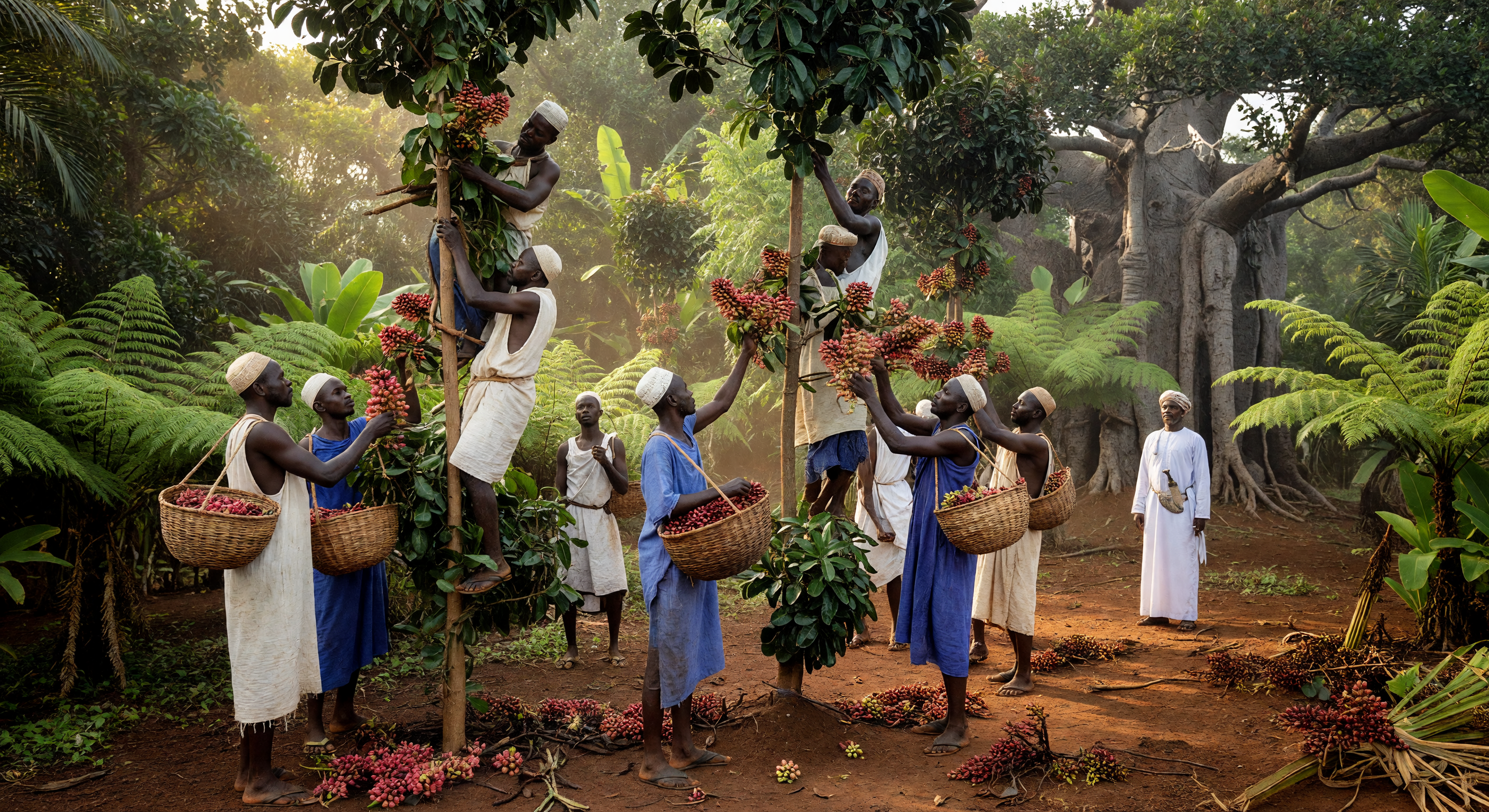 The image depicts a tropical plantation scene on Unguja (Zanzibar) with laborers climbing ladders or trees to harvest reddish clusters from what appear to be tall evergreen trees, baskets for collection, red lateritic soil, ferns, broadleaf plants, and a prominent baobab tree in the background— all visually coherent and plausible for 184s coastal East Africa. Clothing includes simple tunics, wraps, and loincloths on darker-skinned East African laborers (consistent with Swahili coastal and enslaved worker attire) and two figures in white dishdasha-like robes (accurate for Omani overseers under Sultan Seyyid Said's rule). No overt anachronisms like modern tools or architecture; landscape matches Zanzibar's humid, forested clove estates. However, the core scientific inaccuracy is botanical: the large, plump, berry-like clusters (resembling lychee or rambutan) do not match Syzygium aromaticum's small, nail-shaped flower buds in loose, terminal panicles. This requires prompt refinement for accurate depiction. Culturally, it aptly shows labor hierarchy without exaggeration.