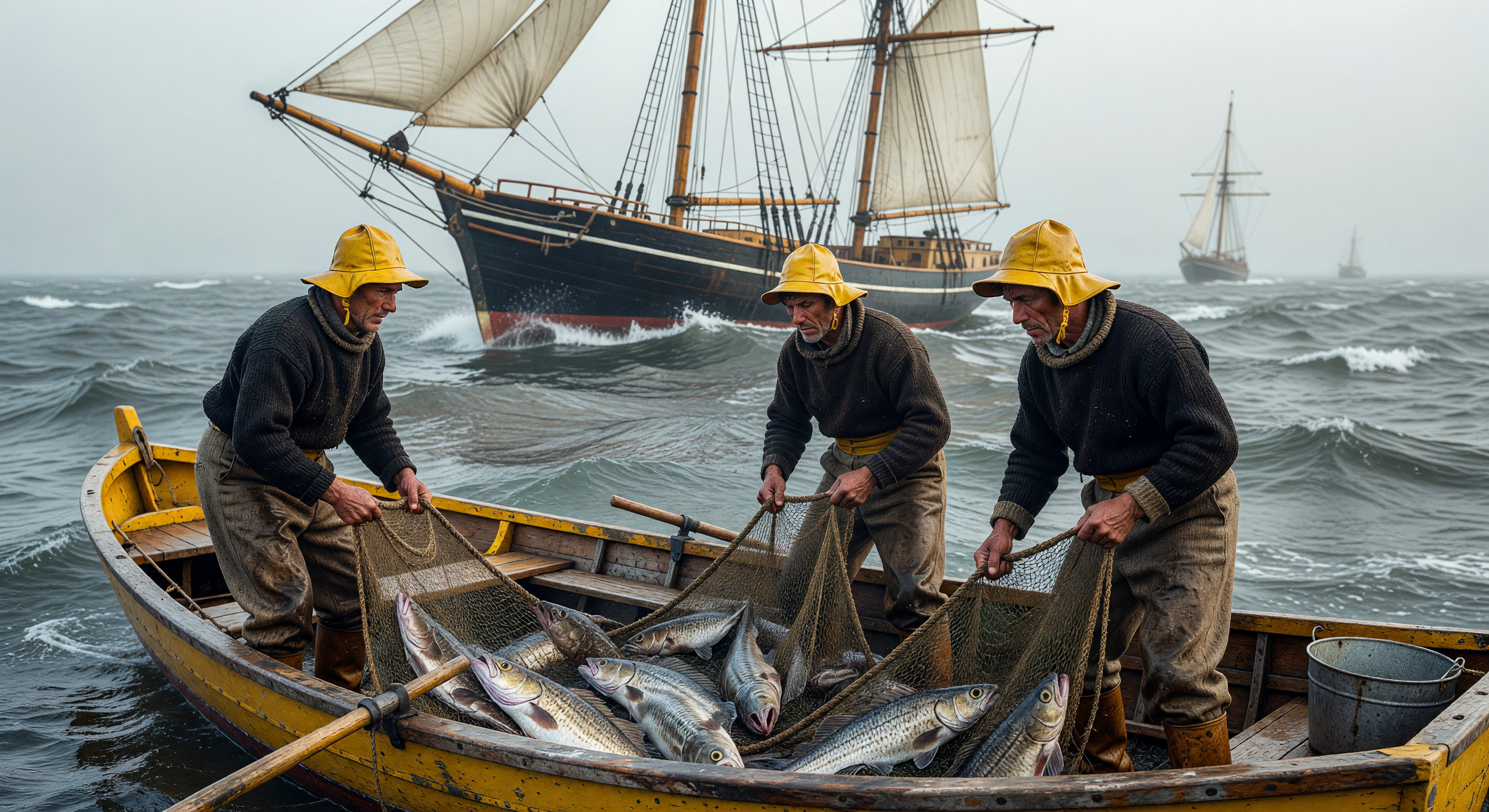 The image depicts three fishermen in a bright yellow wooden dory hauling a net full of silver elongate fish amid choppy North Atlantic waters, with a prominent two-masted black-hulled schooner (gaff-rigged sails) in the background and a distant vessel in misty conditions—visually coherent and plausibly evocative of early 20th-century Grand Banks fishing. Strengths include the manual labor intensity, overcast weather, woolen sweaters, rubber boots, and oars, which align with the harsh interwar environment. However, key issues persist: the dory's vivid yellow paint is anachronistic, as 193s working dories were typically unpainted, tarred black, or oiled in muted tones for practicality and camouflage; the sou'wester hats are unnaturally bright yellow (modern PVC-like rather than dull oiled canvas); the fish resemble herring or mackerel more than Atlantic cod (which have a chin barbel, squatter bodies, and mottled skin); and the net-hauling method mismatches the era's dominant handline/tub trawl techniques used from dories off schooners. The schooner looks well-maintained but appropriately workmanlike, though slightly oversized for typical Banks bankers. No major anachronisms like modern tech, but these details reduce historical fidelity and require prompt tweaks for weathering, colors, fish species, and gear.