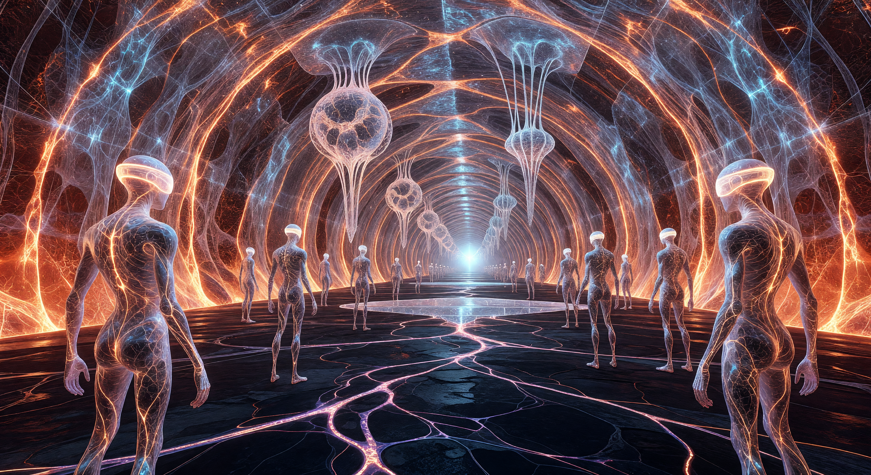 Image: The scene depicts a vast subterranean hall with dark basalt-like floor, luminous energy “veins,” and large, biomech/architectural forms—features that fit the *vibe* of speculative far-future inner-Earth engineering. However, the “inhabitants” are rendered as tall, semi-transparent humanoids with glowing internal filaments and bulbous, tube-like crown structures. While this is plausible for fictional post-biological beings, it doesn’t visually communicate the specific materials named in the caption (e.g., vitrified magma walls, Living Basalt tile self-repair, or floating glass plazas). Also, the architecture includes web-like, organoid “columns” and floating hovering effects that are more reminiscent of abstract cyber-organic design than clear subterranean cathedrals built from geological substrates. Scientific plausibility is also difficult: neutrino containment, Aether-Glass, and “molecular vibration management” are not visually grounded—there’s no clear correspondence between the depicted glowing lines and neutrino lattices or any specific containment mechanism.