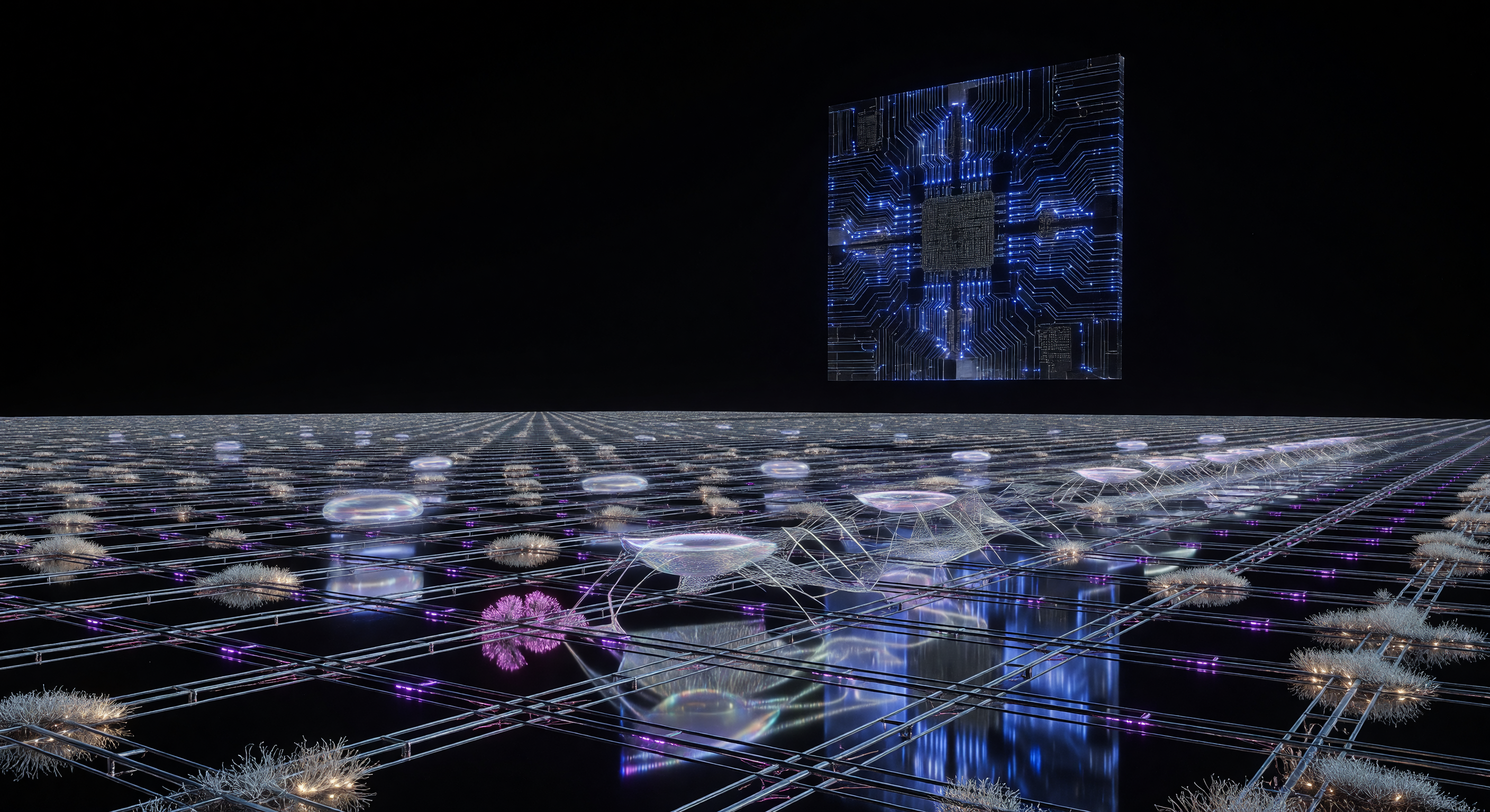 Overall, the image can be kept as a visually consistent futuristic compute landscape, but the caption should be regenerated to match what is actually depicted (e.g., describe a high-efficiency computational lattice/processor field with luminous infrastructure and generic “silicon growths” if desired) and avoid over-specific physics claims that aren’t supported by the artwork.