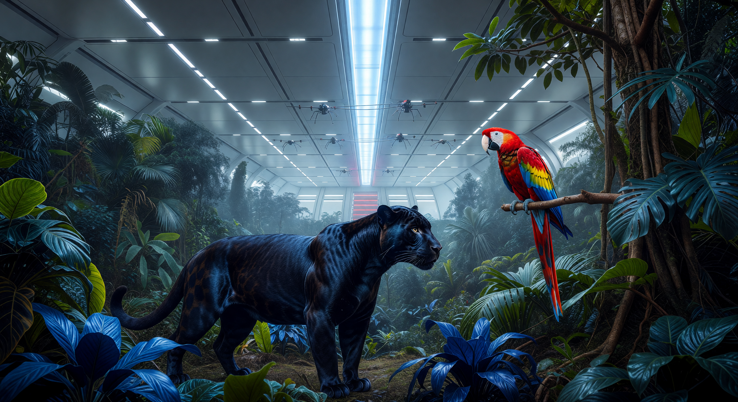 In questa ricostruzione della "Convergenza" (circa 2144 d.C.), un giaguaro (*Panthera onca*) geneticamente risorto si muove furtivo tra la flora ingegnerizzata di un habitat cilindrico a 400 km di quota, puntando un'ara macao in un ecosistema sintetico ad alta efficienza. All'interno dell'Anello Orbitale, la vita biologica coesiste con l'ingegneria estrema: le foglie blu-verdi sono ottimizzate per catturare la luce artificiale dei filamenti al plasma, mentre la gravità centripeta di 0,8g modella la muscolatura snella del predatore. Questa scena testimonia l'era della "Gaia-Macchina", dove la biodiversità terrestre è stata preservata e riconfigurata all'interno di colossali strutture di carbonio alimentate da energia solare spaziale e fusione nucleare.