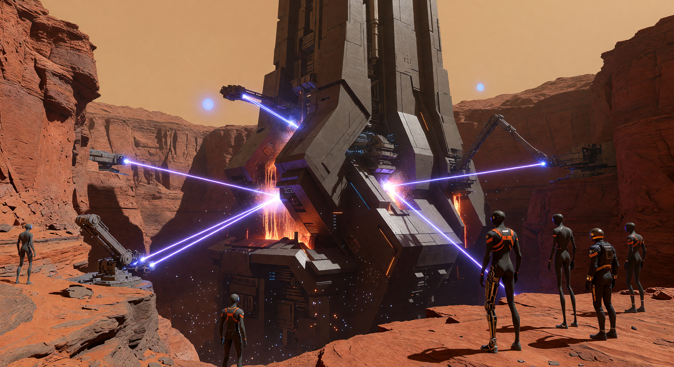 Clothing/people are also only partially supported by the image: there are multiple humanoid figures in sleek, form-fitting suits with colored bands/orange accents and helmets/heads that look standardized, but the image does not provide evidence for the specific claimed biology (e.g., elongated 2.5-meter frames or visibly extreme limb proportions). The “architects” read more as generic personnel/engineers than distinctly “Void-Born” evolutionary outliers. Overall, the visual concept works (future Mars canyon + giant angular installation + cutting beams), but several claimed specifics (laser type/realism, biological traits) are not substantiated by what’s visibly shown.