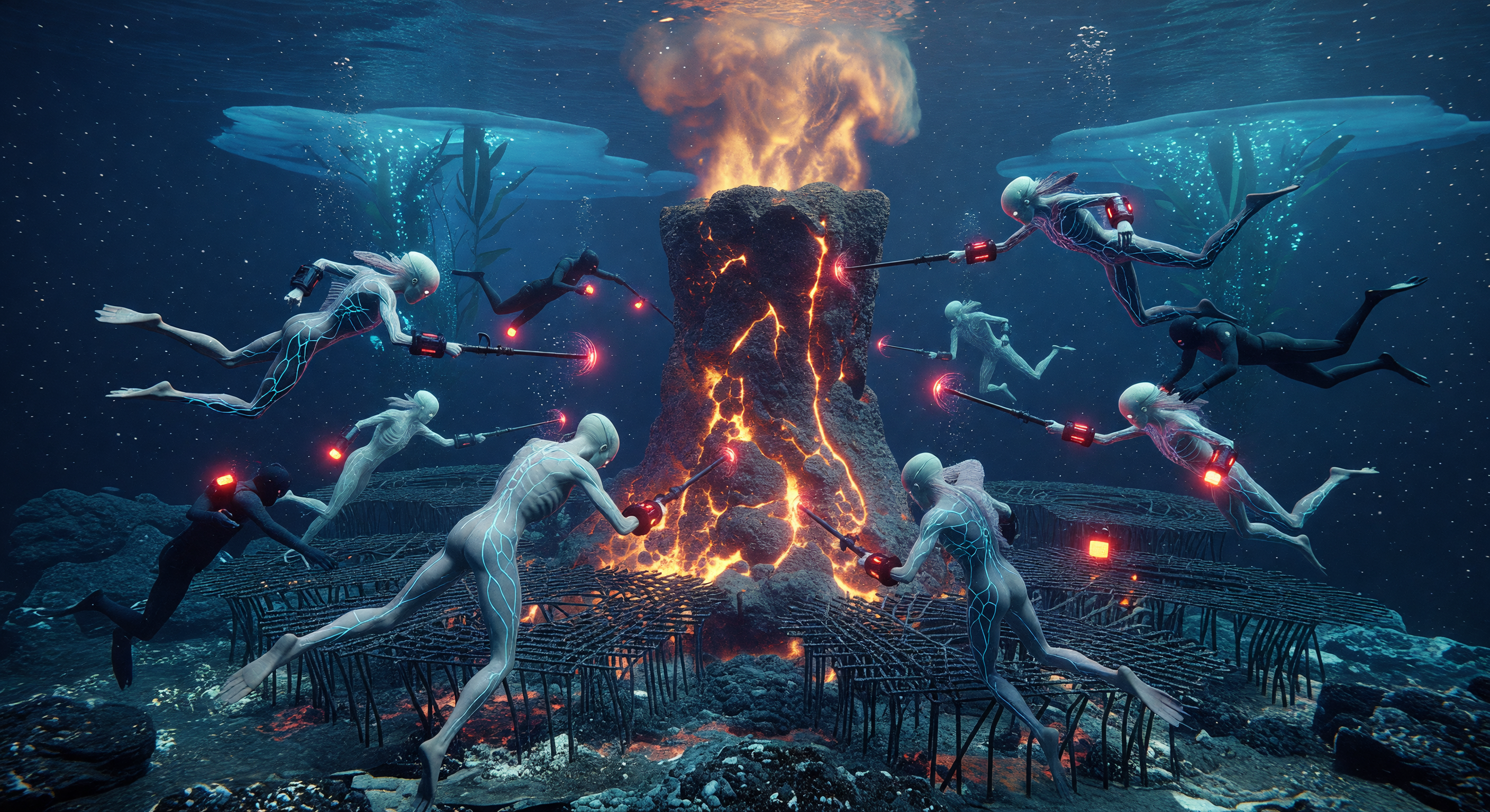 The image successfully establishes an underwater environment with post-human combatants surrounding a central hydrothermal structure. The figures are appropriately alien — elongated, pale, streamlined, with vestigial features and bioluminescent vein-like markings consistent with extreme biological adaptation. The grid-like thermoelectric arrays surrounding the vent base are a plausible rendering of heat-harvesting infrastructure. However, several significant scientific problems undermine the image's accuracy. Most critically, open flames are visible rising from the vent and suspended in the water column — fire cannot exist underwater, and this is a fundamental physical error. The vent should emit superheated mineral-rich fluid plumes (black or white smoker effluent), not combustion flames. Additionally, what appear to be large whale-like silhouettes and kelp-like vegetation are visible in the background. Europa's ocean almost certainly cannot support macroscopic photosynthetic flora given the absence of sunlight, and Earth-like whale analogs would be extraordinarily improbable in this setting without explicit narrative justification. The figures' heads lack clearly rendered bio-sonar melons as described in the caption — the cranial structures are smooth and featureless, which partially undermines the caption's specific anatomical claims.