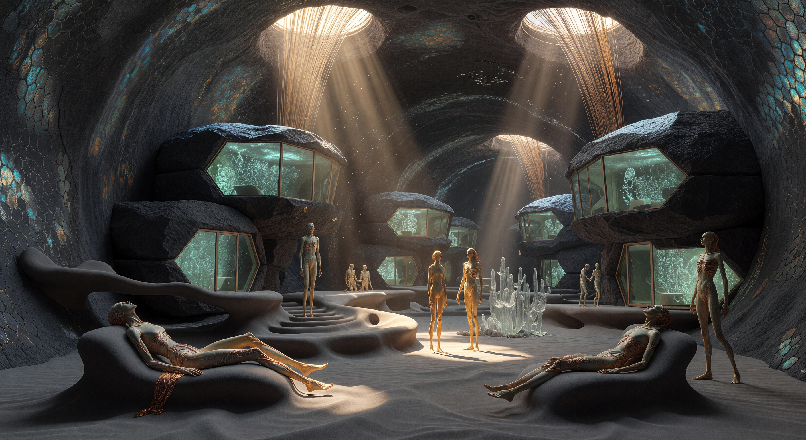Questa veduta cattura le monumentali arterie del Tube-Grid di Arsia su Marte intorno al 2380 d.C., nel pieno della Grande Divergenza. All'interno di un vasto tubo di lava basaltica, gli Espansionisti Litici — discendenti umani biologicamente adattati alla bassa gravità — hanno plasmato l'ambiente tramite sinterizzazione molecolare, integrando moduli abitativi esagonali e piazze in schiuma polimorfica cinetica. L'oscurità del sottosuolo è squarciata da imponenti pozzi solari a fibre ottiche, che proiettano fasci di luce dorata su una civiltà che ha trasformato la geologia aliena in un ecosistema architettonico d’avanguardia.