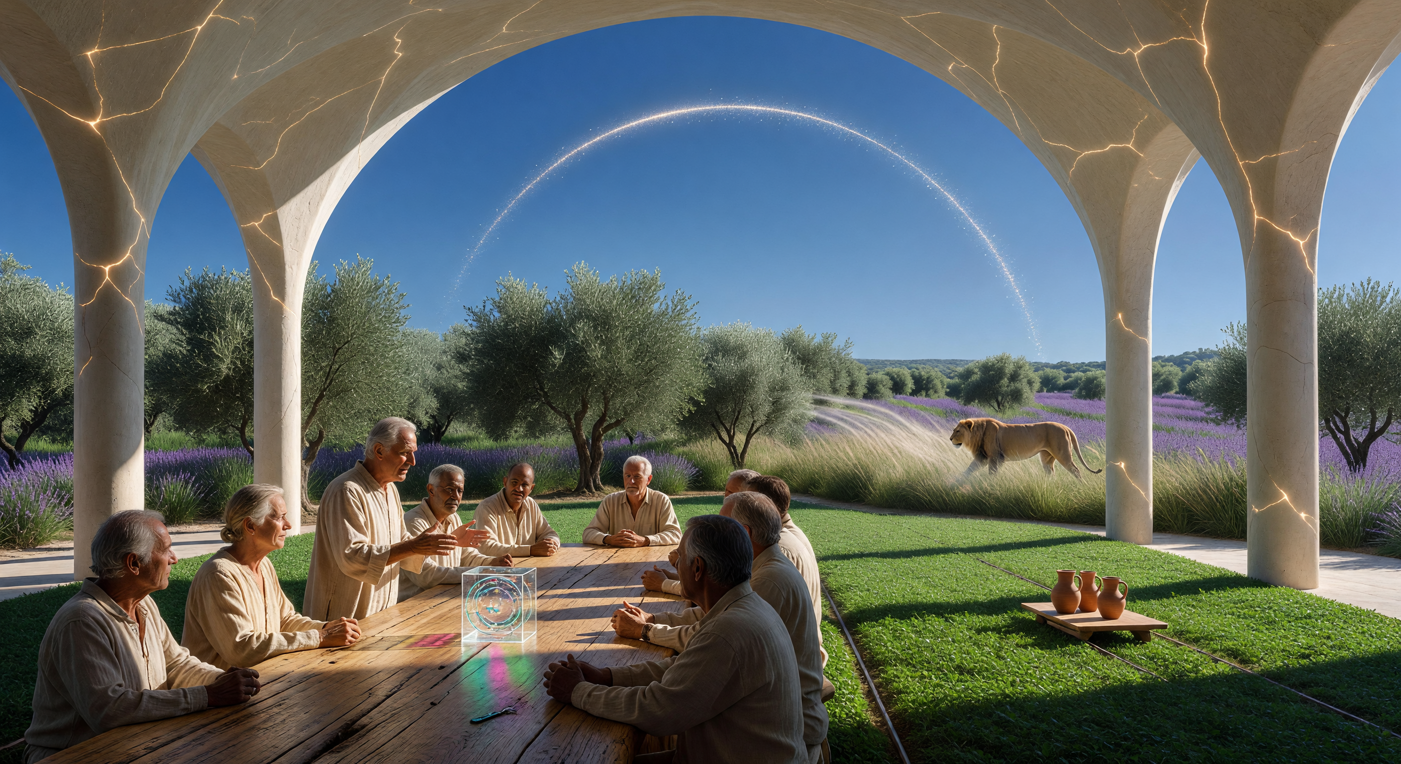 L’immagine coglie efficacemente un ambiente pastorale, sereno e ispirato al Mediterraneo: strutture bianche ad arco con sottili motivi luminosi simili a venature, che evocano un’architettura biomimetica avanzata, adatta a una «Bio-Pure Enclave» in un’epoca lontana del futuro. I «baseline» umani, seduti attorno a un tavolo di legno grezzo e lavorato in modo rozzo e vestiti con semplici tuniche beige, comunicano una semplicità non aumentata. Il paesaggio circostante — alberi di ulivo, campi di lavanda, erba curata e un felino lontano simile a un leone — rappresenta plausibilmente un ecosistema ripristinato, con megafauna de-estinta (de-extincted) e flora ottimizzata. Il cubo traslucido luminoso sul tavolo suggerisce un qualche dispositivo computazionale analogico e l’arco simile a un arcobaleno nel cielo funge da rappresentazione artistica di una «Dyson swarm». Tuttavia, i problemi chiave includono: l’assenza di una costa visibile che indebolisce la rivendicazione di «costa mediterranea» (sembra trovarsi nell’entroterra); il leone appare come un generico Panthera leo (possibilmente una leonessa) senza distinguere tratti tipici dei leoni dell’Atlante, come una criniera più scura e più folta o una specifica morfologia della Barbary; il dispositivo sembra fotonico/olografico invece che fluidico (che dovrebbe mostrare canali microfluidici visibili o elementi pneumatici); e l’arco di Dyson è visivamente poco credibile, poiché una sciame (swarm) altererebbe la luminosità solare o causerebbe spostamenti spettrali, non un pulito alone arcobaleno. Piccoli anacronismi, come eventuali irrigatori sullo sfondo, sottraggono anche all’idea di una gestione tecnologica di alto livello.