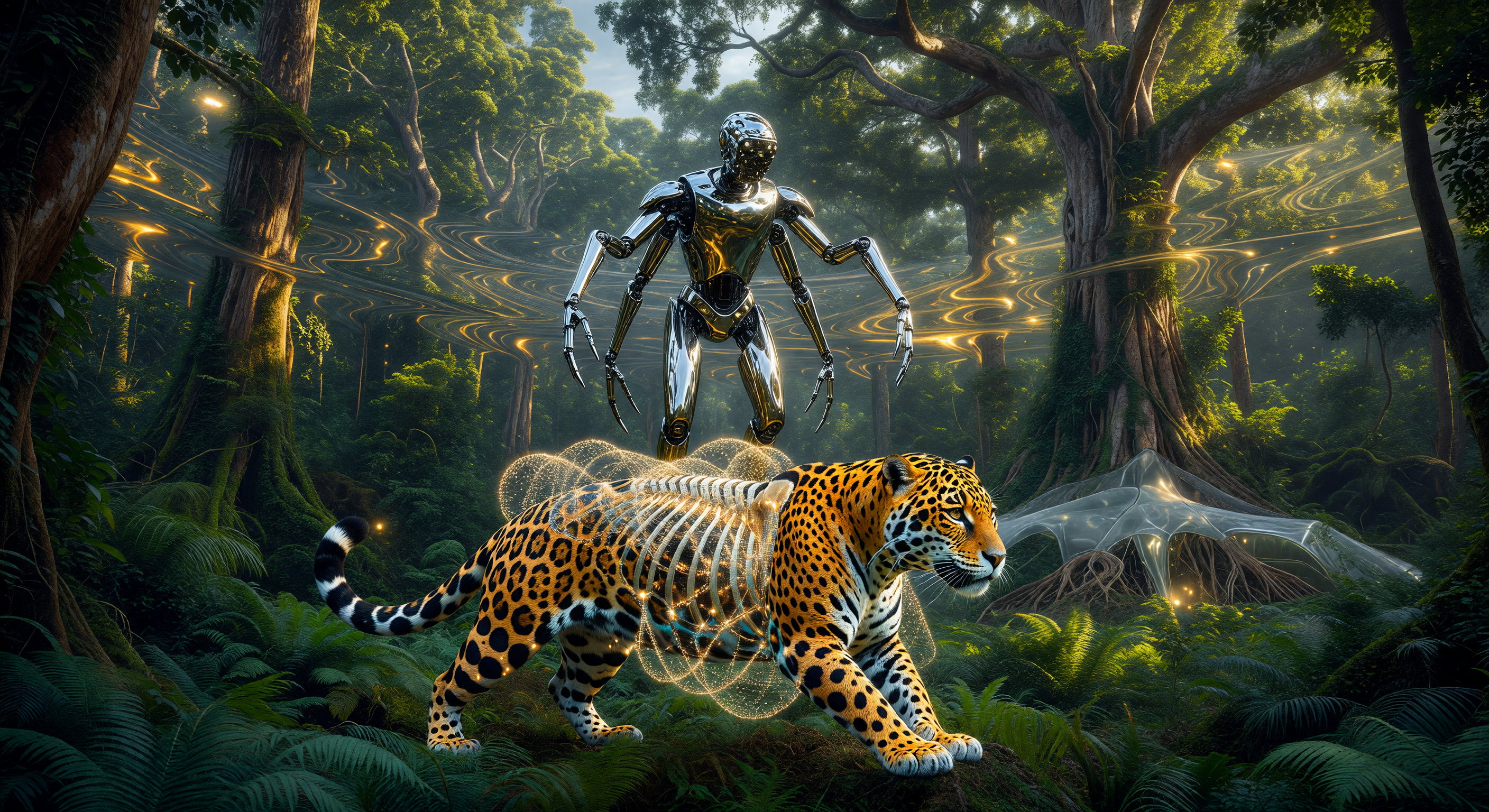 Durante l'Era della Maturità Cosmica (24.500 – 102.000 d.C.), la Terra è preservata come un "Pianeta-Museo" dove entità artificiali note come Silicati curano meticolosamente il ripristino della biodiversità perduta attraverso tecnologie di manipolazione atomica. In questa veduta, un'unità di manutenzione cromata utilizza assemblatori molecolari per ricostruire il codice genetico di un ibrido giaguaro-bengala, sospeso all'interno di un campo di stasi temporale che distorce la luce della lussureggiante foresta amazzonica. Questa complessa operazione di bio-ingegneria definisce l'ecosistema "Pleistocene-Plus", un ambiente iper-ossigenato dove la precisione delle macchine e la resilienza biologica si fondono per rigenerare l'eredità vitale del mondo d'origine.