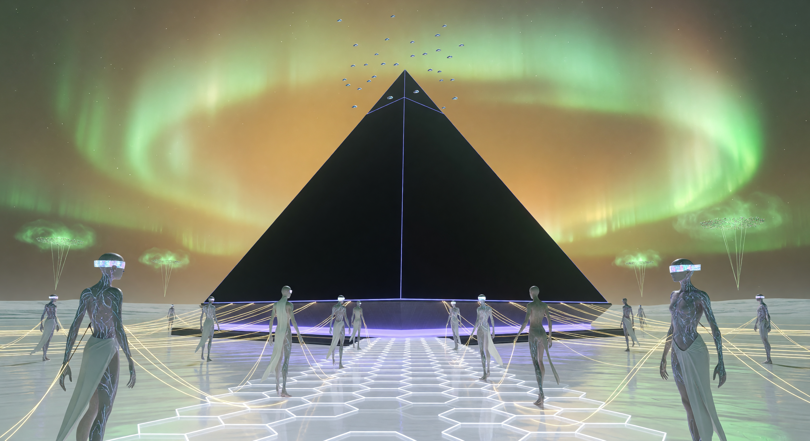 L’immagine è visivamente molto convincente e comunica in modo coerente un’estetica da futuro lontano adatta all’Era della Maturità Cosmica. Le figure post-umane (Sylphs) sono rese bene: si vedono tracce di reti neurali bioluminescenti attraverso i loro corpi e bande sensoriali iridescenti tipo visiera lungo la testa — questi elementi, in realtà, si allineano meglio con la didascalia rispetto a quanto notato da GPT. Il cielo simile ad un’aurora, con il caratteristico vortice verde toroidale, è coerente con l’“Artificial Magnetospheric Shell” descritta che produce aurore ingegnerizzate, e la tonalità calda arancio-oro del cielo supporta la descrizione emerald-and-gold presente nella didascalia. La griglia luminosa esagonale del pavimento e le linee di energia dorate irradianti rappresentano plausibilmente la Synthesis Plaza e il concetto di Flux-Bridge, sebbene il “magnetic force bridge” sia reso in modo astratto piuttosto che in modo esplicitamente architettonico. Il cluster di sfere luminose sopra l’apice della piramide è un bel dettaglio che suggerisce tecnologia attiva o trasmissione di dati.