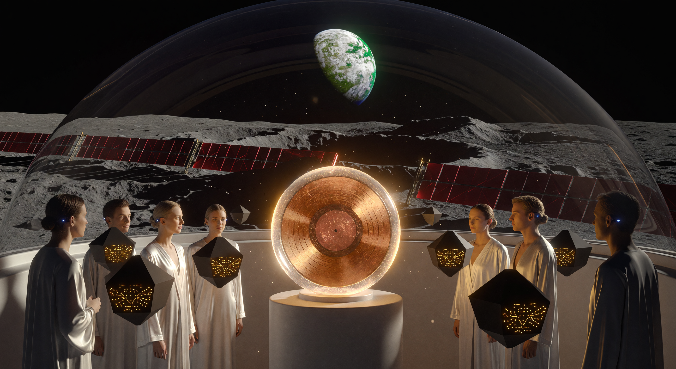 All'interno di una cupola in vetro-diamante sulla superficie lunare, i visitatori dell'Era della Maturità Cosmica (20.000–100.000 d.C.) osservano il leggendario *Voyager Golden Record*, l'antico messaggero dell'umanità verso le stelle sospeso in un campo di stasi. La scena ritrae la coesistenza tra gli "Originali", esseri umani dal genoma preservato, e i droni-SIM, avatar poliedrici di menti puramente digitali, uniti nella contemplazione di una Terra-Museo meticolosamente restaurata che brilla nell'oscurità del vuoto. Questo santuario tecnologico, alimentato da nuclei a micro-buchi neri e protetto da vasti sciami di Dyson, rappresenta il culmine di millenni di evoluzione biologica e sintetica nel Braccio Locale della galassia.