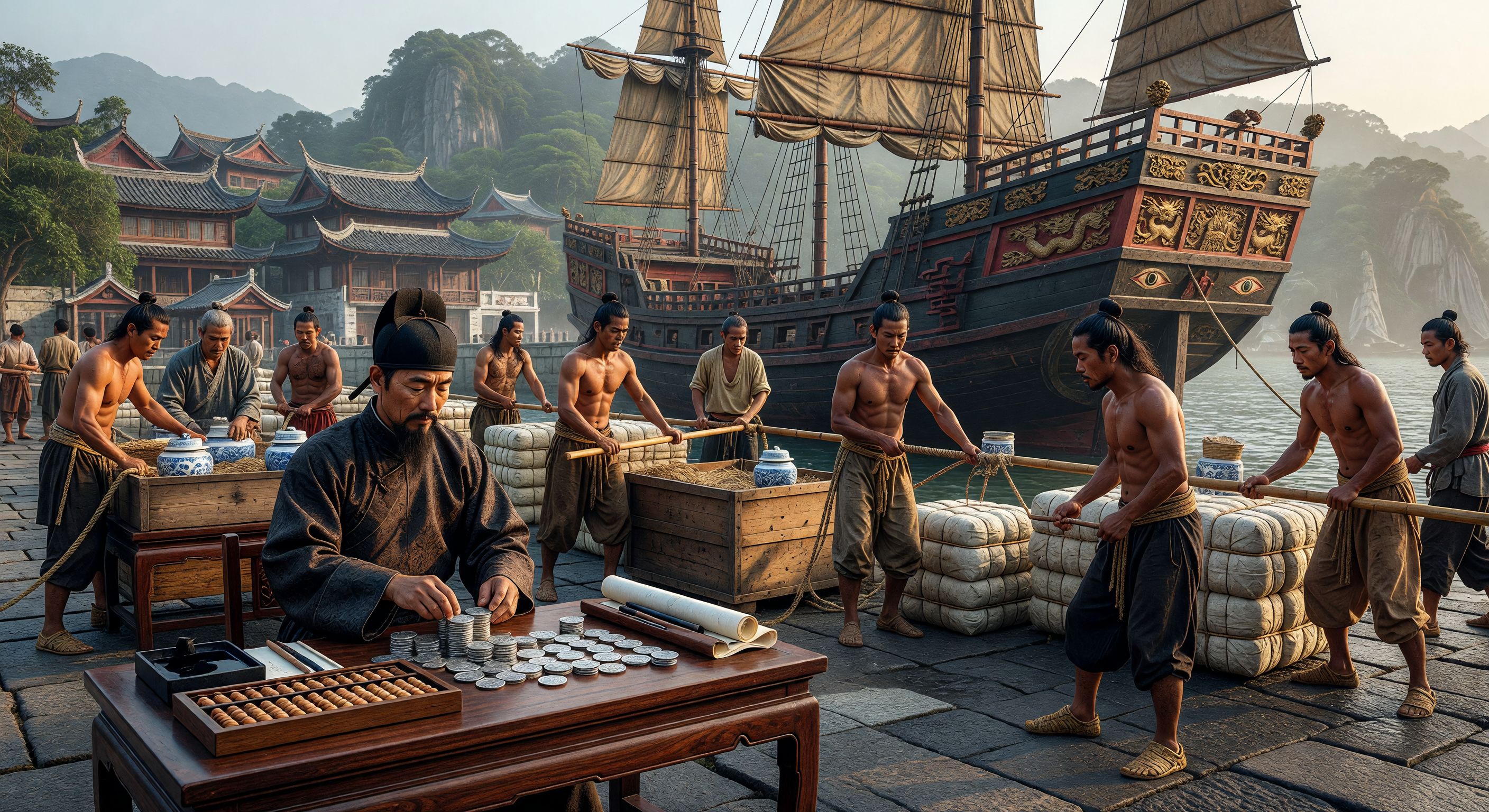 The image captures a reasonably evocative late Ming port scene with several strong elements: the merchant's dark official-style robe and black gauze cap (wusha mao) are plausible for a prosperous Ming-era trader or minor official; the abacus on the table is period-appropriate; blue-and-white porcelain vessels are correctly depicted as trade goods; and the stone-paved wharf with bracketed Chinese architecture in the background reads as credibly Fujianese. The baled cargo (likely silk or cotton) and wooden crates are consistent with period trade goods. However, the ship in the background is the most significant visual problem: it displays the hull form and square-rigged sails of a European carrack or galleon rather than a Chinese junk. Ming junks used battened lug sails on multiple masts with a very different hull profile—the vessel shown appears to be a Western ship with Chinese decorative elements (dragon carvings) grafted onto it, which is historically incoherent. The bare-chested laborers, while not impossible, could benefit from minimal clothing more consistent with Ming-era depictions of dock workers. The stacked round coins also look more like standardized minted discs than the period-typical mix of silver ingots (sycee/yuanbao) and cash coins.
