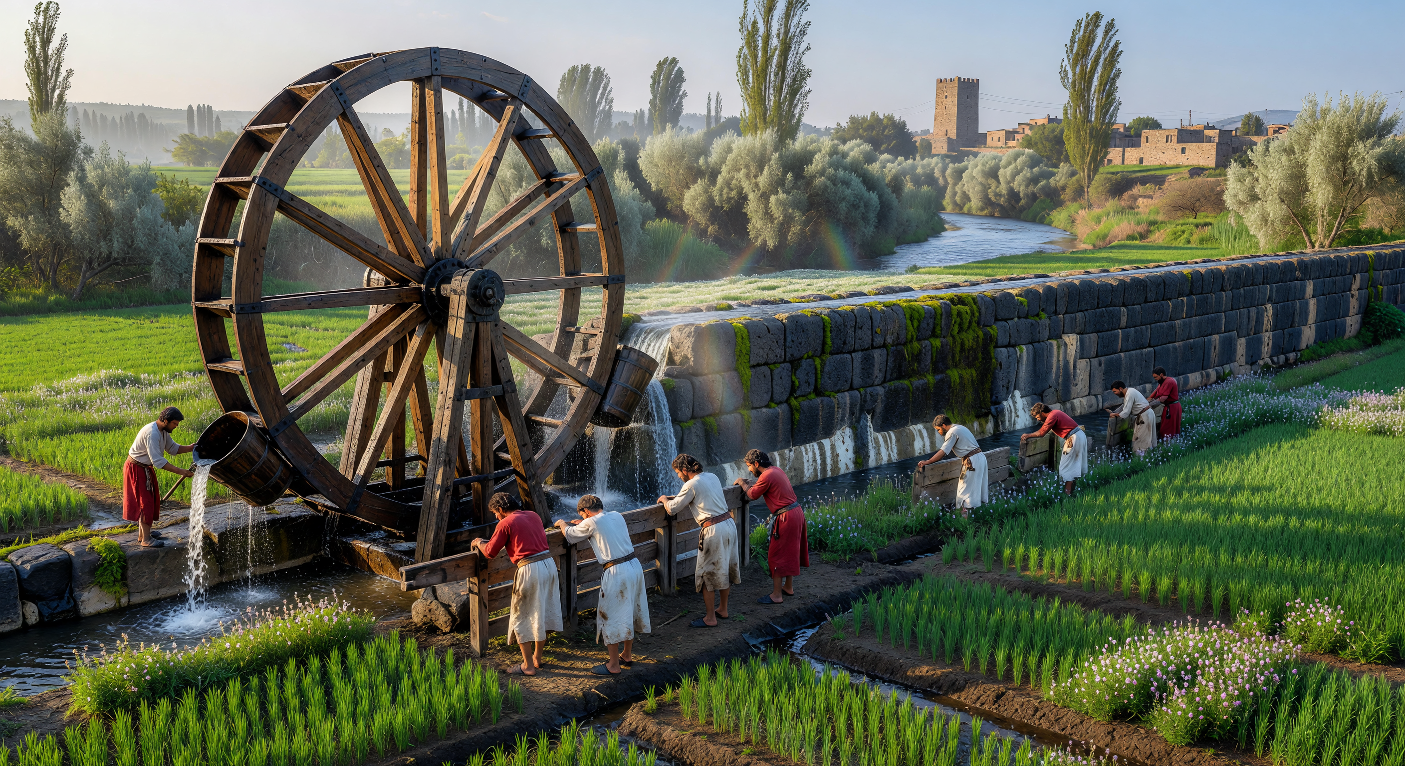 Una maestosa noria in legno di quercia e pioppo svetta sulla valle dell'Oronte nel IV secolo d.C., sollevando ritmicamente l'acqua verso un imponente acquedotto in basalto destinato all'irrigazione. Questa sofisticata opera d'ingegneria idraulica dell'Antichità Tarda permetteva di trasformare il paesaggio in fertili distese di orzo e lenticchie, pilastri dell'economia rurale del Levante bizantino. Tra i riflessi dorati del mattino, contadini aramei in tuniche di lino manovrano le chiuse, testimoniando un'epoca in cui l'ingegno tecnico e la gestione delle risorse idriche garantivano la prosperità delle comunità mediorientali.
