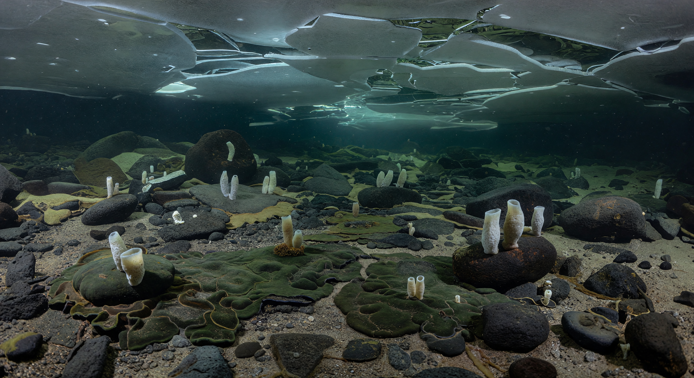 - Português: Refúgio marinho sob o gelo com esponjas primitivas