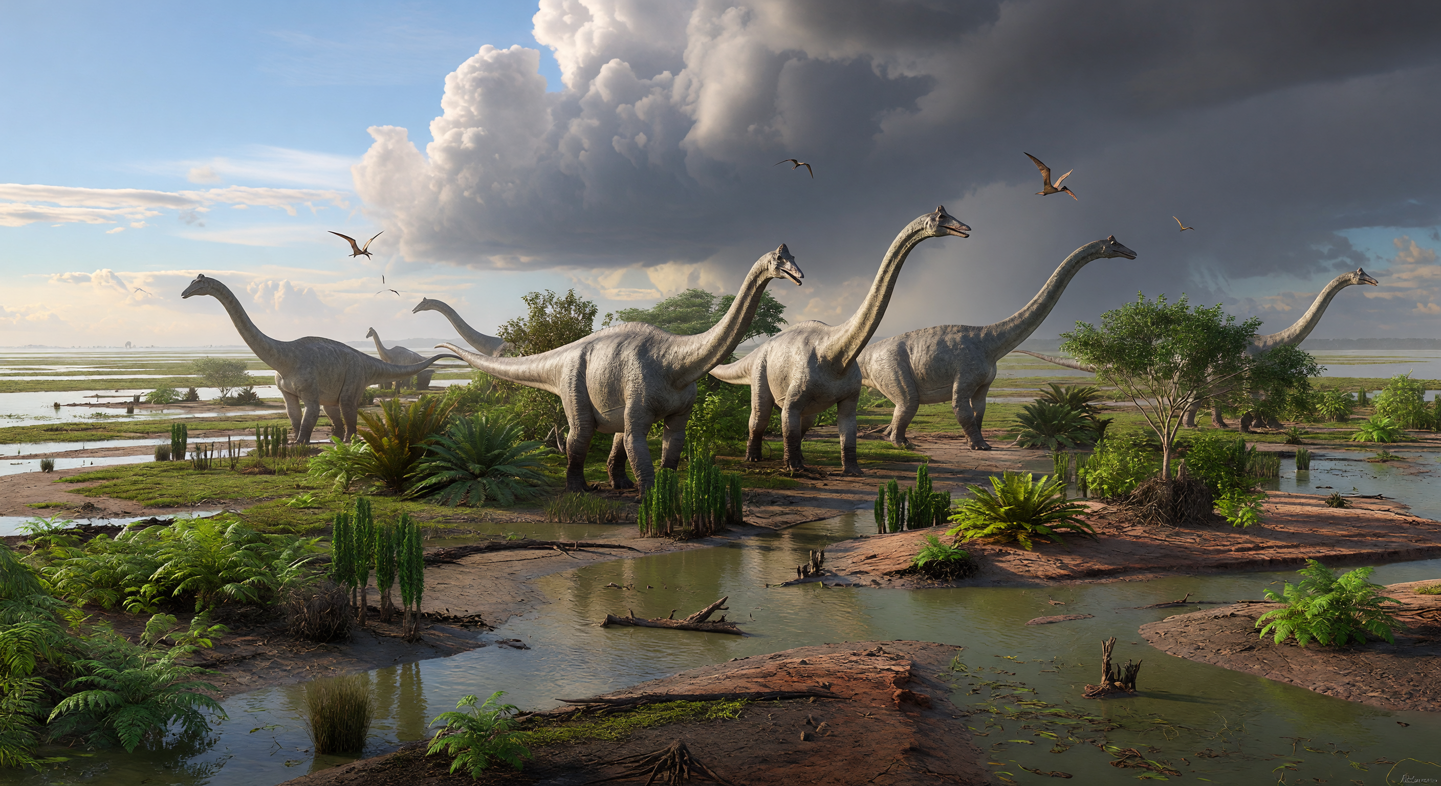 約950万年前、白亜紀後期セノマニアン期の北アフリカ沿岸低地では、全長25〜26メートルに達する巨大なティタノサウルス類パラリティタン(Paralititan stromeri)の群れが、ぬかるんだ分流路やシダの茂み、初期の被子植物の低木林のあいだをゆっくりと採食しながら進んでいました。上空には翼開長4〜5メートルほどのアンハングエラ類に似た翼竜が湿った季節風の空を旋回し、遠くにはテチス海南縁のデルタと汽水の潟が広がります。こうした環境は、温暖な温室地球だった白亜紀赤道帯に発達したモンスーン性の氾濫原で、泥質のチャネル、鉄に富むシルト、腐植質の湿地堆積物が、この巨大草食恐竜たちの暮らした海辺の湿地世界を今に伝えています。