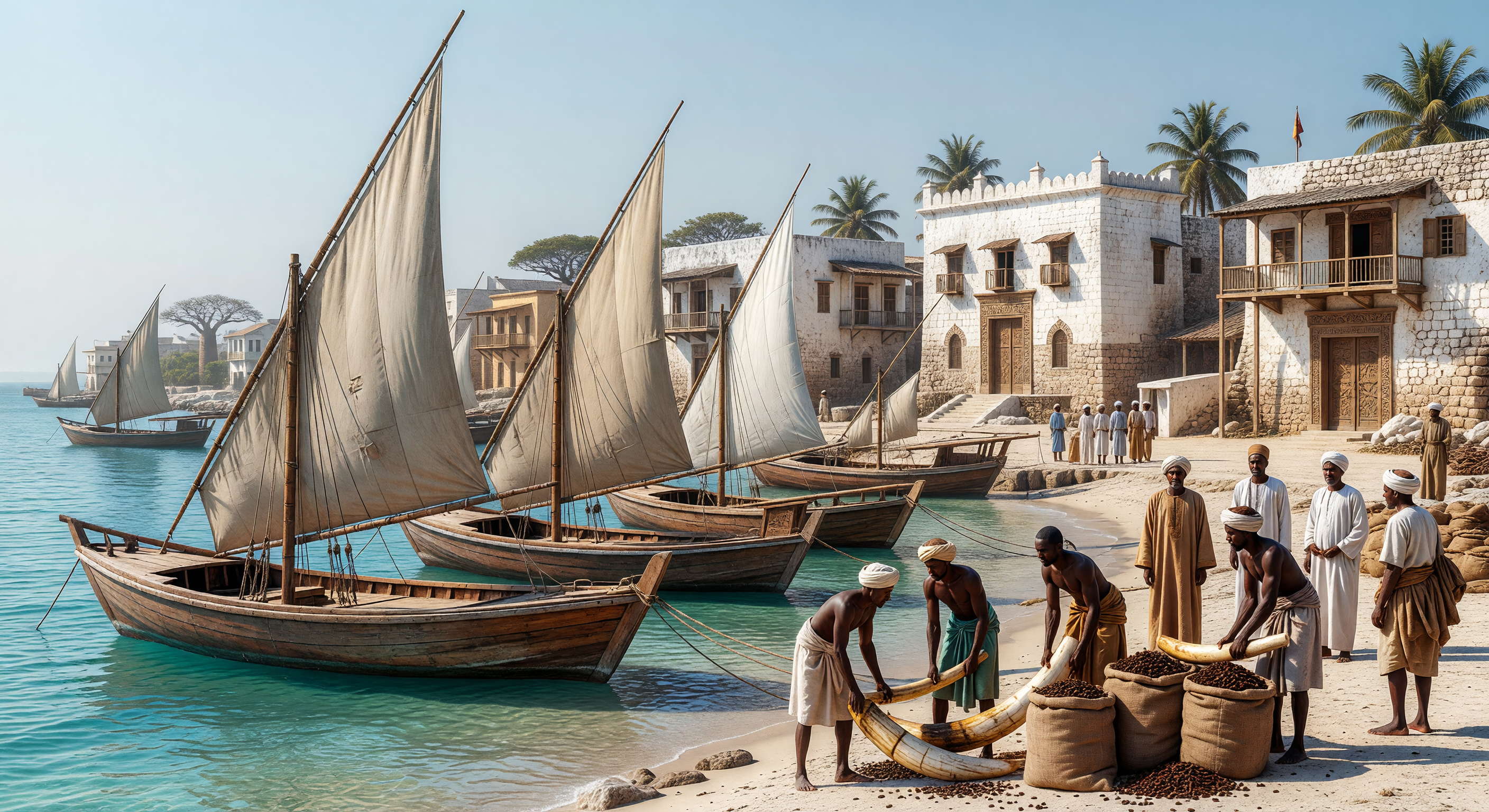 この画像は、19世紀後半のザンジバル、ストーン・タウンのいくつかの典型的特徴を効果的に捉えている。すなわち、特徴的な三角帆を備えたラティーン帆装のスワヒリのダウ船、精巧に彫刻された木製扉(ザンジバルの「スワヒリ扉」)を備える白い石灰塗りのサンゴ石建築、胸壁のある壁、木造バルコニー、ココヤシ、そしてカンズ、ターバン、簡素な巻布といった時代に即した服装をまとい、オマーン、インド、アフリカの影響を反映した多様な商人たちの群衆である。ターコイズ色の海水と全体的な海辺の雰囲気も、ザンジバル港としてもっともらしい。しかし、いくつかの重要な問題が正確性を損なっている。海岸線が、船が気軽に浜に引き上げられた砂浜として描かれている点である。実際のストーン・タウンの港は、189年までには石造の岸壁、桟橋、倉庫が並ぶ高密度な都市的海浜空間であり、この描写は活気ある首都というより地方のスワヒリ村落に見えてしまう。象牙の牙は著しく巨大化されており(中には船体とスケールを競うものさえある)、これは象牙としても視覚的に不自然である。また、麻袋の中身は黒っぽい丸い物体で、クローブの小さく暗褐色で釘状の乾燥した蕾というより、ナツメヤシの実やビンロウジの実のように見え、キャプションとの不一致を生じている。場面全体も過度に演出され、静かすぎて、大規模交易拠点に期待される労働者、小舟、積み上げられた貨物の混沌とした密度が欠けている。大きな時代錯誤はないが、教育的な妥当性のためにはこれらの細部の改善が必要である。