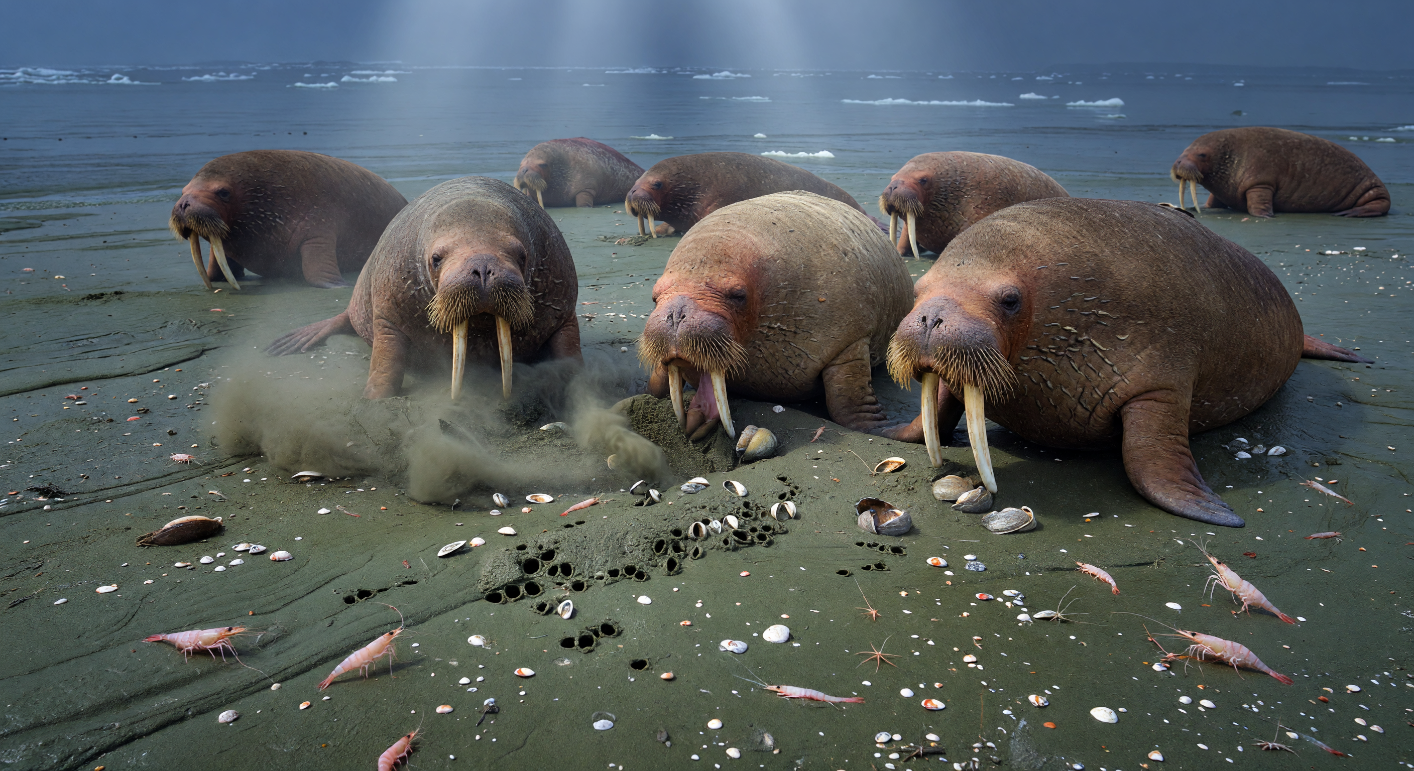 更新世後期、およそ数万年前の氷期に海面が下がったベーリンジア大陸棚では、セイウチ(Odobenus rosmarus)が金色がかった長いひげと象牙の牙で泥質砂の海底を掘り返し、オオノガイの仲間 Mya truncata や二枚貝 Serripes groenlandicus を吸い出して食べていました。画面には、緑灰色に濁った浅海底にできた新しい掘り跡と舞い上がるシルト、逃げ惑うホッコクアカエビ(Pandalus borealis)やクモヒトデ類が描かれ、巨大な頭部と牙をもつセイウチの圧倒的な大きさが際立ちます。こうした冷たく浅いベーリング海の海底は、氷期の「マンモス・ステップ」に隣接する海の豊かな採食場であり、陸のメガファウナ世界と結びついた北太平洋の生態系を今に伝えています。