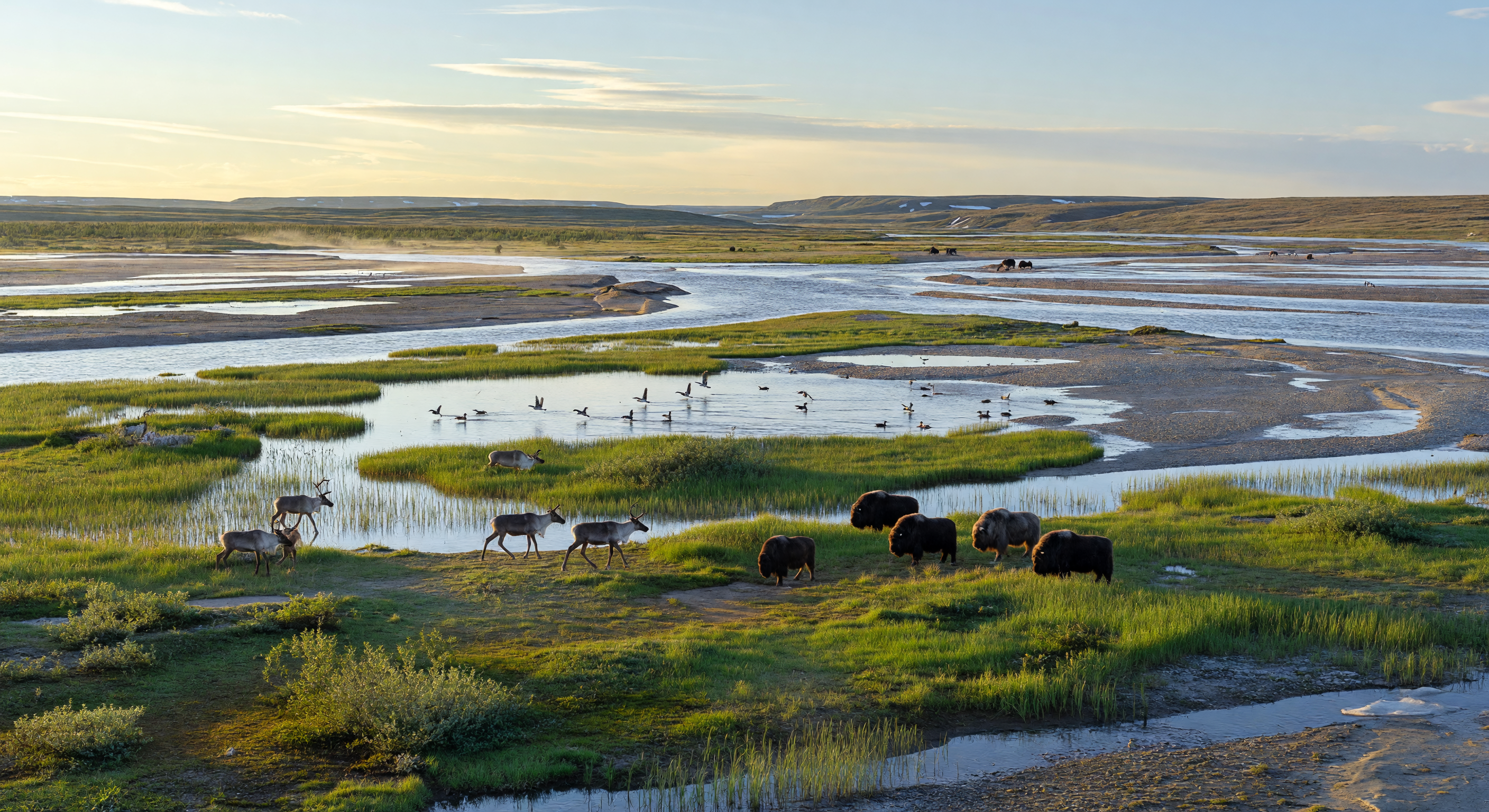 - हिन्दी: बेरिंगियाई ग्रीष्मकालीन आर्द्रभूमि में रेंडियर और मस्क बैल