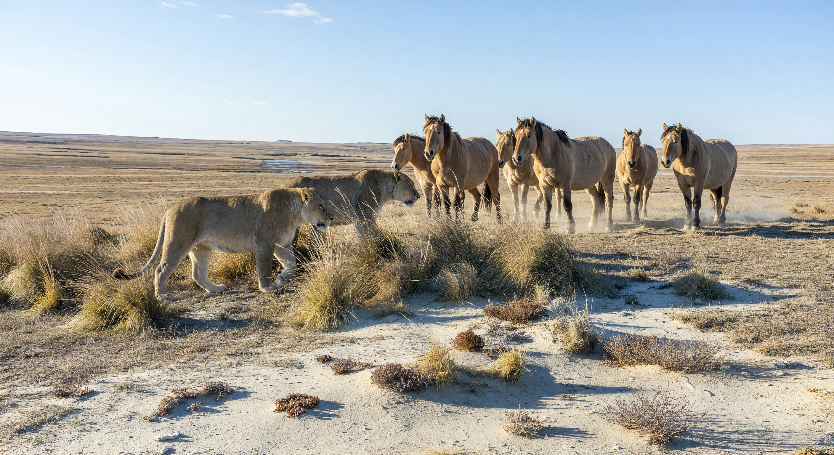 Regarding the caption, while the biological and ecological context is generally sound, it suffers from a disconnect between the text and the visual evidence. Claiming the lions have a 'long-legged build' when the image displays the opposite is a significant narrative error. My colleagues were correct to point out the taxonomic shorthand; while Equus ferus is acceptable, referencing the specific steppe-adapted populations (often grouped under E. ferus ferus or similar nomenclature) would add necessary rigor. I disagree with GPT's call for a full regeneration of the caption; the scientific foundation is accurate, it simply requires alignment with the visual reality (e.g., changing the description of the predators' posture and body morphology to match the provided image, or adjusting the image to match the caption's description of a 'crouching' stalk).
