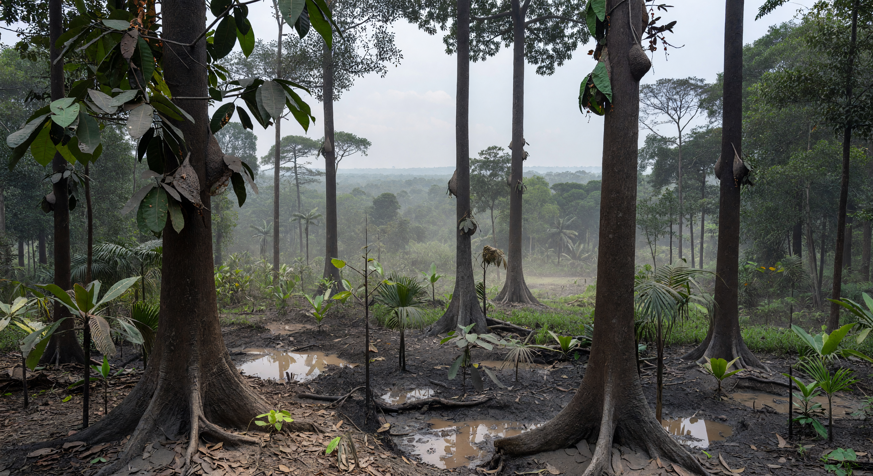 Paragraph 2: IMAGE issues identified by at least one reviewer: (1) no clearly visible, species-specific Oecophylla smaragdina weaver ant nests; the dark hanging objects could be nests but are not identifiable as woven leaf nests. (2) The ash deposition is not convincingly rendered: the ground reads as generic mud/soil or a degraded forest floor rather than fine gray tephra, and there is no obvious ash dusting on trunks, buttress roots, or pools. (3) The scene reads more like an African Congo-basin forest than northern Sumatra/Sundaland. (4) The understory palms look African-like, possibly Raphia/fan palms, rather than Southeast Asian Sundaland flora. (5) The background appears semi-open with savanna-like clearings and spaced trees rather than a closed-canopy lowland dipterocarp rainforest. (6) The specific dipterocarp morphology is not convincingly shown; trunks/crowns do not clearly match characteristic Shorea/Dipterocarpus structure. (7) The lighting is muted, but not distinctly the sulfurous/yellow-gray ash-choked atmosphere suggested by the historical setting.