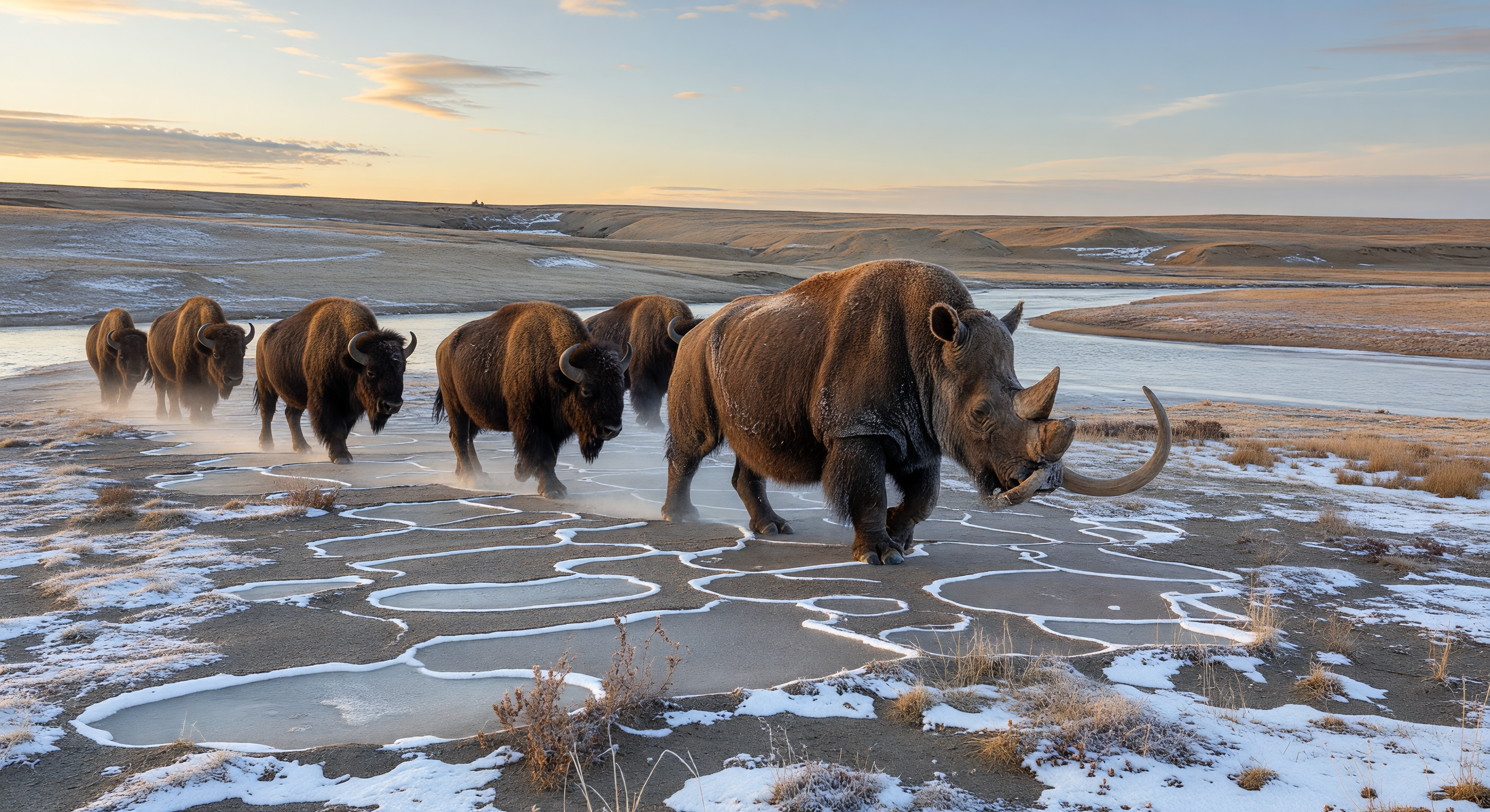 The committee agrees that the scene broadly and convincingly evokes a Late Pleistocene mammoth-steppe/periglacial setting: the open treeless landscape, frost-cracked ice-wedge polygon ground, sparse grasses, snow patches, and cold low-angle light are all appropriate, and the bison herd reads generally as Ice Age megafauna in motion. The caption is also broadly aligned with accepted mammoth-steppe ecology and timing, and the taxonomic pairings are plausible for the region and period.