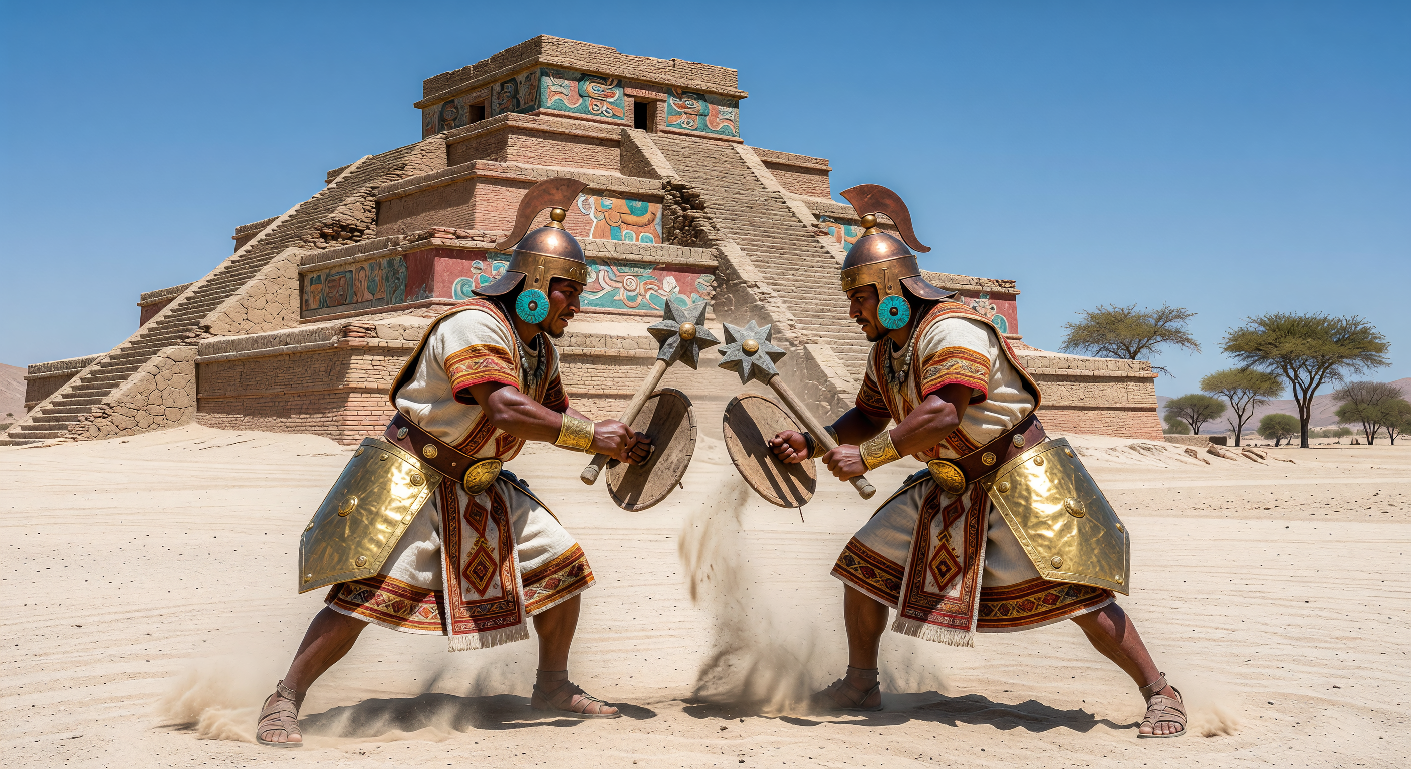 The image depicts two warriors in ritual combat before a stepped adobe huaca with colorful friezes, set against the arid northern Peruvian coast with acacia-like trees and sand dunes—elements broadly accurate for Moche culture (c. AD 100-800). The landscape, monumental temple-pyramid (reminiscent of Huaca del Sol or El Brujo), vibrant textiles with geometric patterns, large ear spools, and stone-headed/star maces align with Moche iconography from ceramics and murals, showing elite warriors in feathered or ornate garb wielding clubs. However, significant anachronisms persist: the crested, open-faced helmets are unmistakably Greco-Roman (Corinthian-style), not Moche, which favored elaborate zoomorphic headdresses, feather crests, or metal ear ornaments without such metallic casques. The pteruges-like gold skirt armor and large round wooden shields evoke Roman legionaries more than Andean warriors, who are typically shown in minimal protection grappling foes by the hair in ritual 'trophy head' combat per Moche vase paintings. These Old World intrusions make the scene culturally implausible, requiring full regeneration for authenticity.