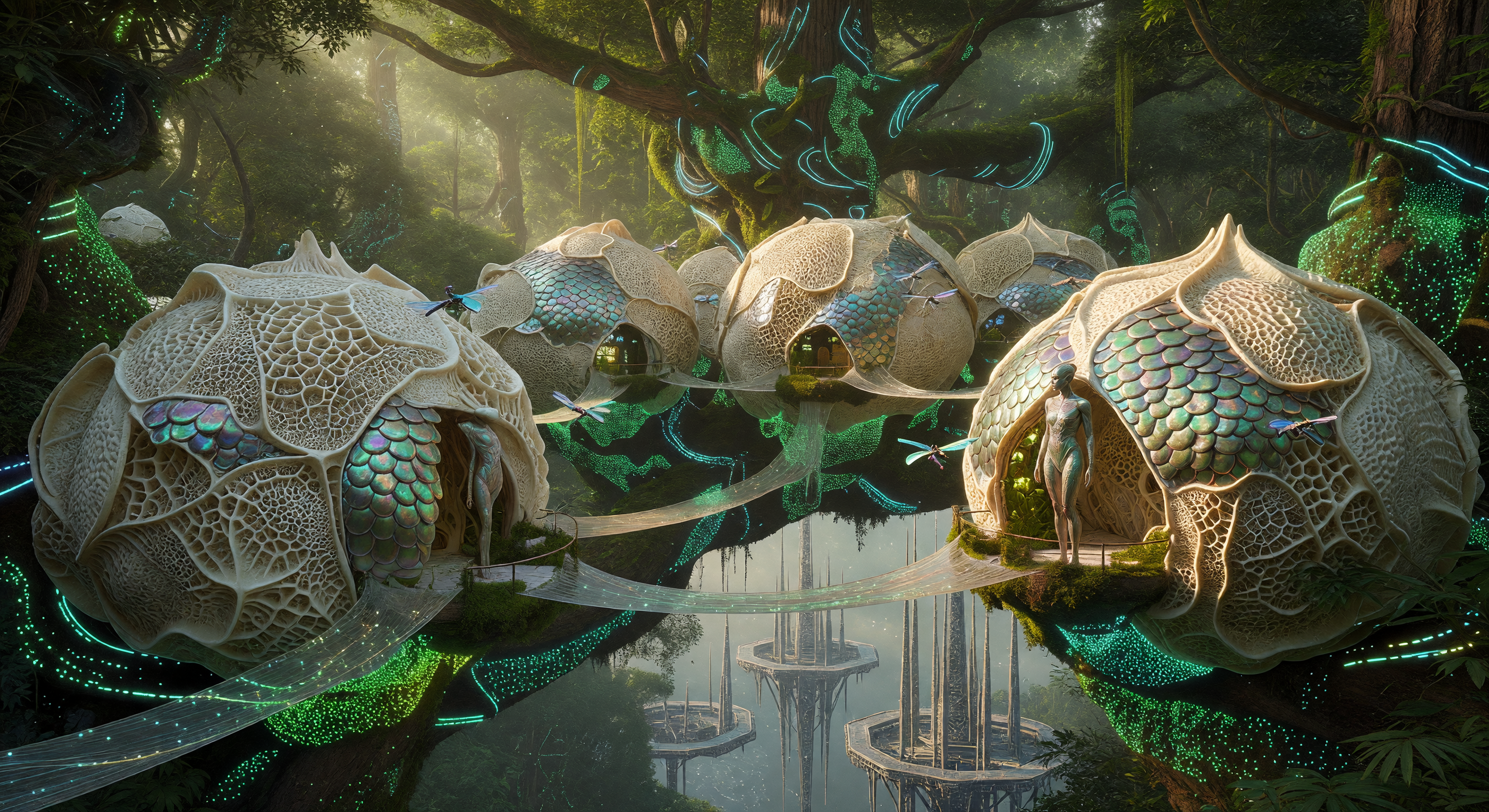 Paragraph 1: The committee agrees the image is a strong speculative bio-architecture scene: it clearly shows organic pod-dwellings embedded in a forest canopy, cream-colored lattice-like shells, iridescent scale/chitin-like panels, translucent bridge-walkways, glowing swarm-like bioluminescent accents, and a human figure that helps anchor the setting. The caption also broadly matches the intended worldbuilding vocabulary of the Great Divergence: mycelial housing, advanced biomaterials, drone maintenance, and a bioluminescent ecosystem are all conceptually consistent with the prompt.