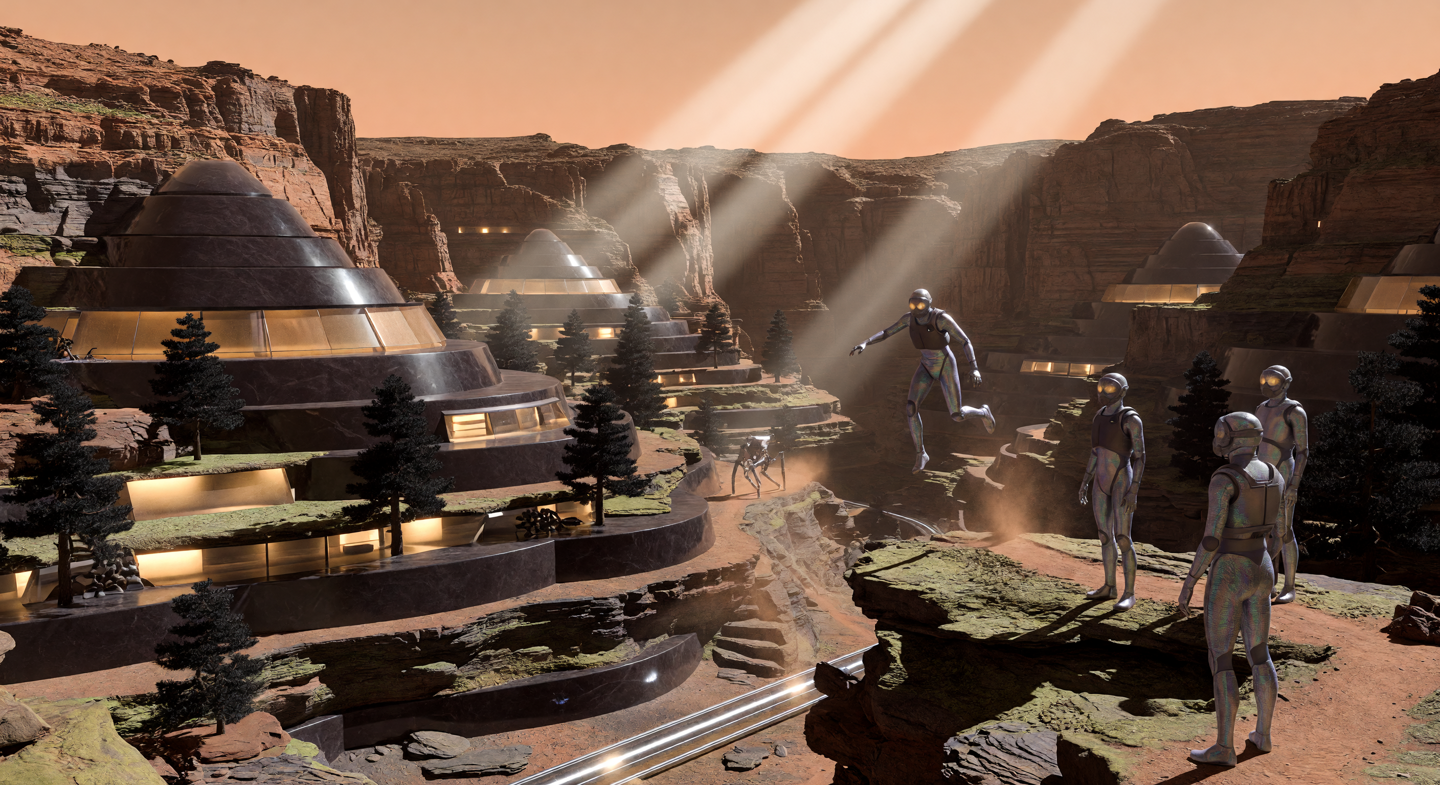 The committee agrees the scene successfully evokes Noctis Labyrinthus on Mars: layered canyon walls, tiered cliff-integrated habitats, warm internal lighting, dramatic sunbeams, and visible transit infrastructure all support the Green Mars speculative setting. There is also broad agreement that the surface figures are meant to read as pressure-suited or Thermo-Skin-clad inhabitants, and that the overall architecture is coherent enough to salvage.