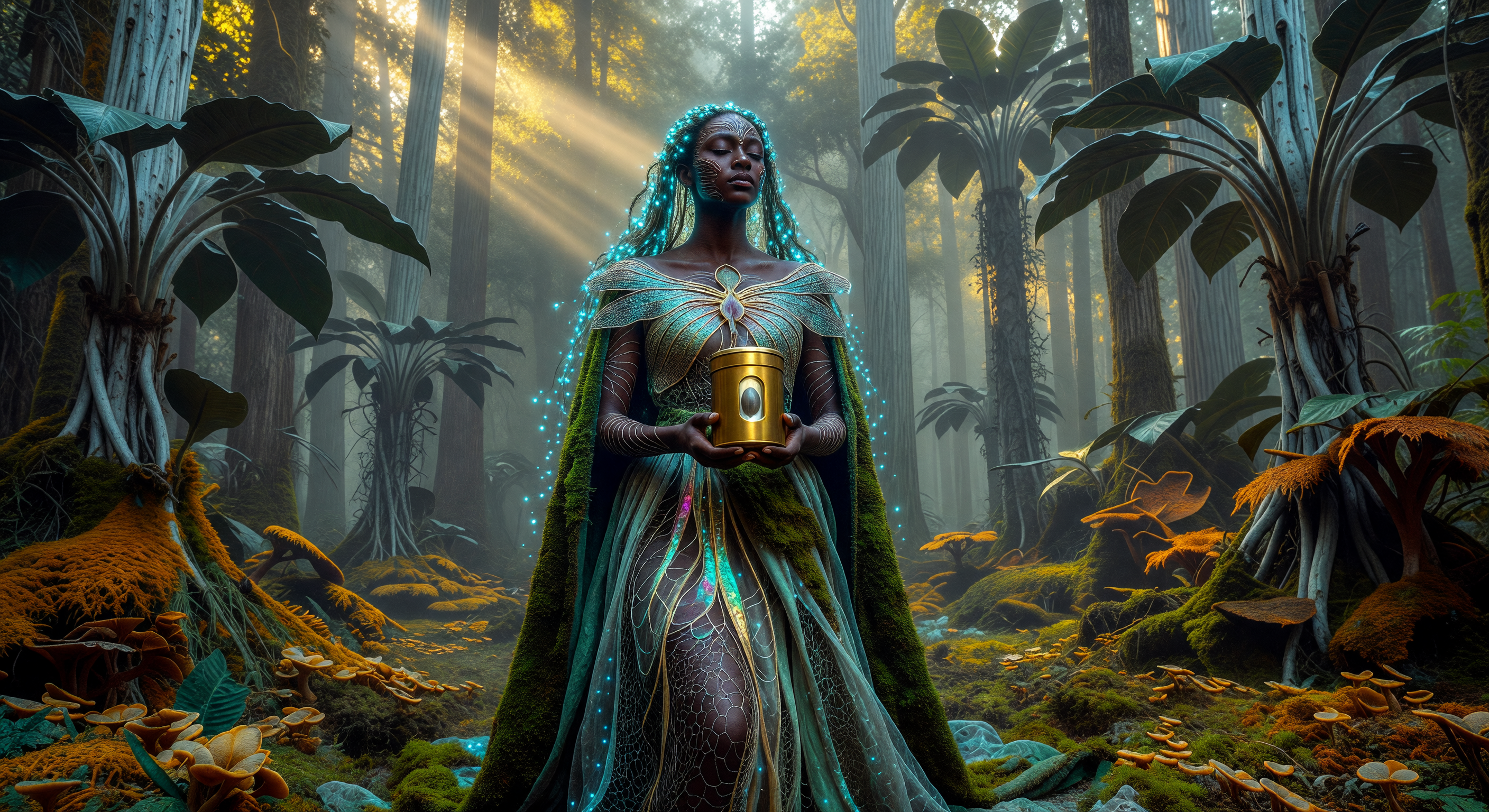 The image effectively establishes a biocentric, far-future aesthetic that aligns well with the Great Divergence period's speculative trajectory. The moss-covered cloak, translucent lace-like garments with vein patterns, bioluminescent cyan hair, and facial markings all cohesively suggest grown/symbiotic textiles and genetic aesthetic modification. The forest floor ecology — oversized fungi, dense mosses, layered megaflora — reads as a plausible hyper-rich biosphere. The atmospheric light shafts reinforce the 'cathedral grove' description effectively. However, the gold cylindrical Seed-Core is the most visually jarring element: it reads unambiguously as polished manufactured metal with an optical lens window, which contradicts the era's supposed shift away from industrial manufacturing toward biological integration. A more organically-grown container would better serve the worldbuilding. Additionally, while the background trees are impressively tall, the image lacks any clear scale cue to support the '200-meter mega-flora' claim — the canopy appears more consistent with present-day redwood scale.