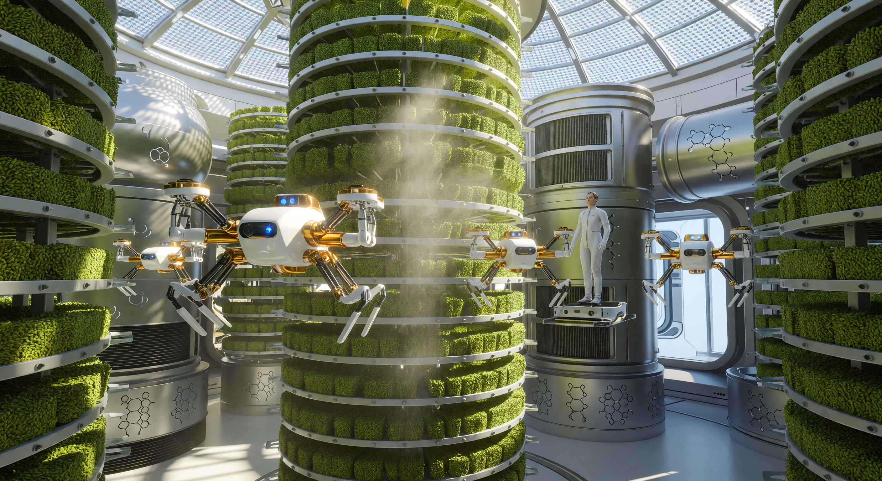 - English: AI drones harvesting aeroponic crops in Vinci-4 green-ring