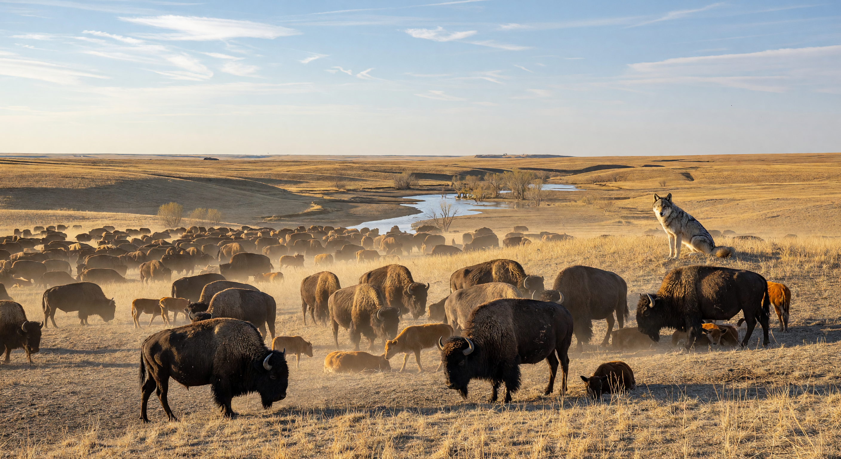 The image is historically and scientifically accurate for the North American Great Plains circa 184, depicting a vast shortgrass prairie with dormant golden grasses, a sinuous creek lined with sparse trees, and a massive herd of American bison (Bison bison) showing correct morphology: high shoulder humps, shaggy forequarters, and varied ages including reddish-orange calves. The warm late-afternoon lighting, rolling horizon, and dust from the herd enhance visual coherence and plausibility for a pre-industrial 'Big Sky' wilderness. The lone grey wolf (Canis lupus) on a grassy rise observes from a safe distance outside the main herd flow, which is ecologically reasonable as wolves scout from periphery rather than charging in solo. No anachronisms like fences, settlements, or modern tech appear; flora and fauna align with shortgrass prairie ecology. Seasonal cues (dormant grasses suggesting late season) are plausible for bison behavior, as herds moved year-round, outweighing minor calf color concerns in this context.