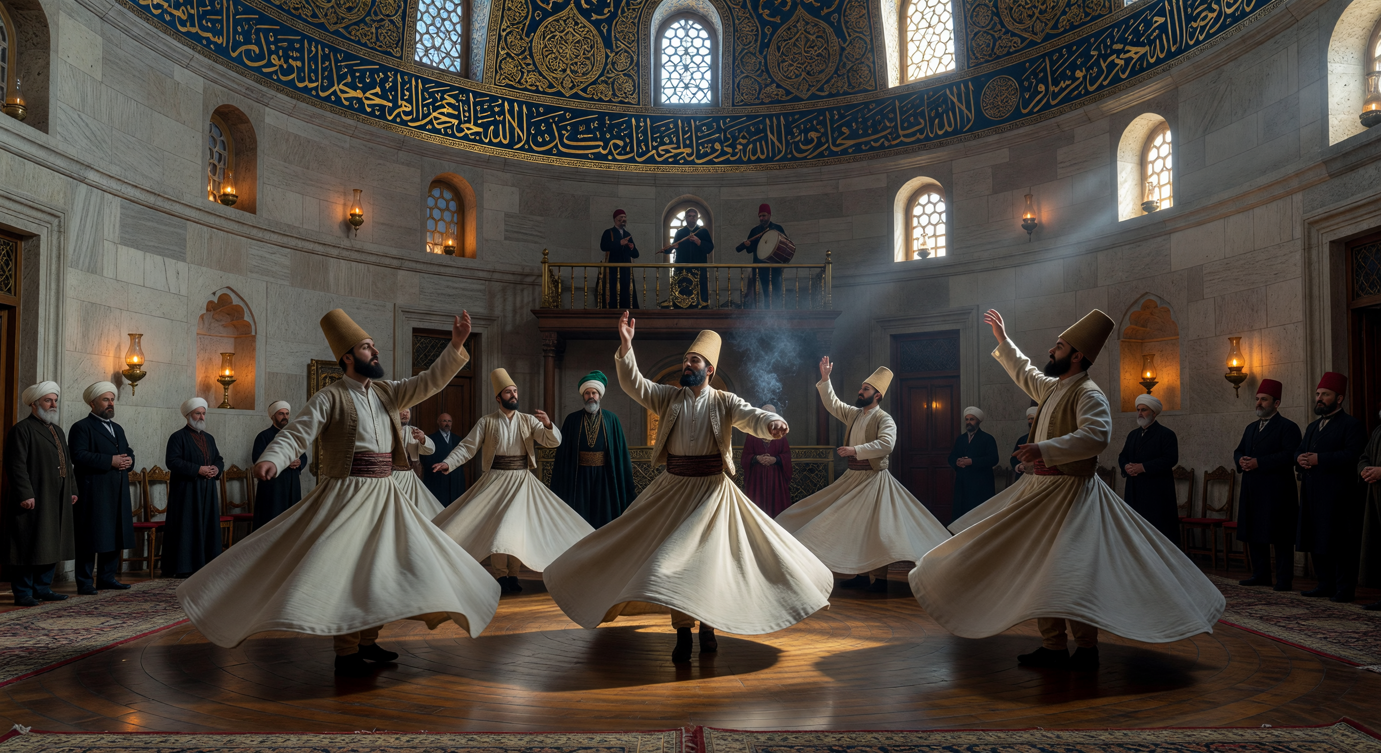 The committee broadly agrees that the image convincingly depicts a Mevlevi Sema ceremony in an Ottoman religious interior: the whirling dervishes, tall felt caps, flowing white skirts, domed space, Arabic calligraphy, oil lamps, arched windows, and mixed audience of turbans and fezzes are all culturally and visually plausible. The ritual atmosphere and Ottoman-era setting are strong, and several reviewers found the image accurate enough in its core composition.