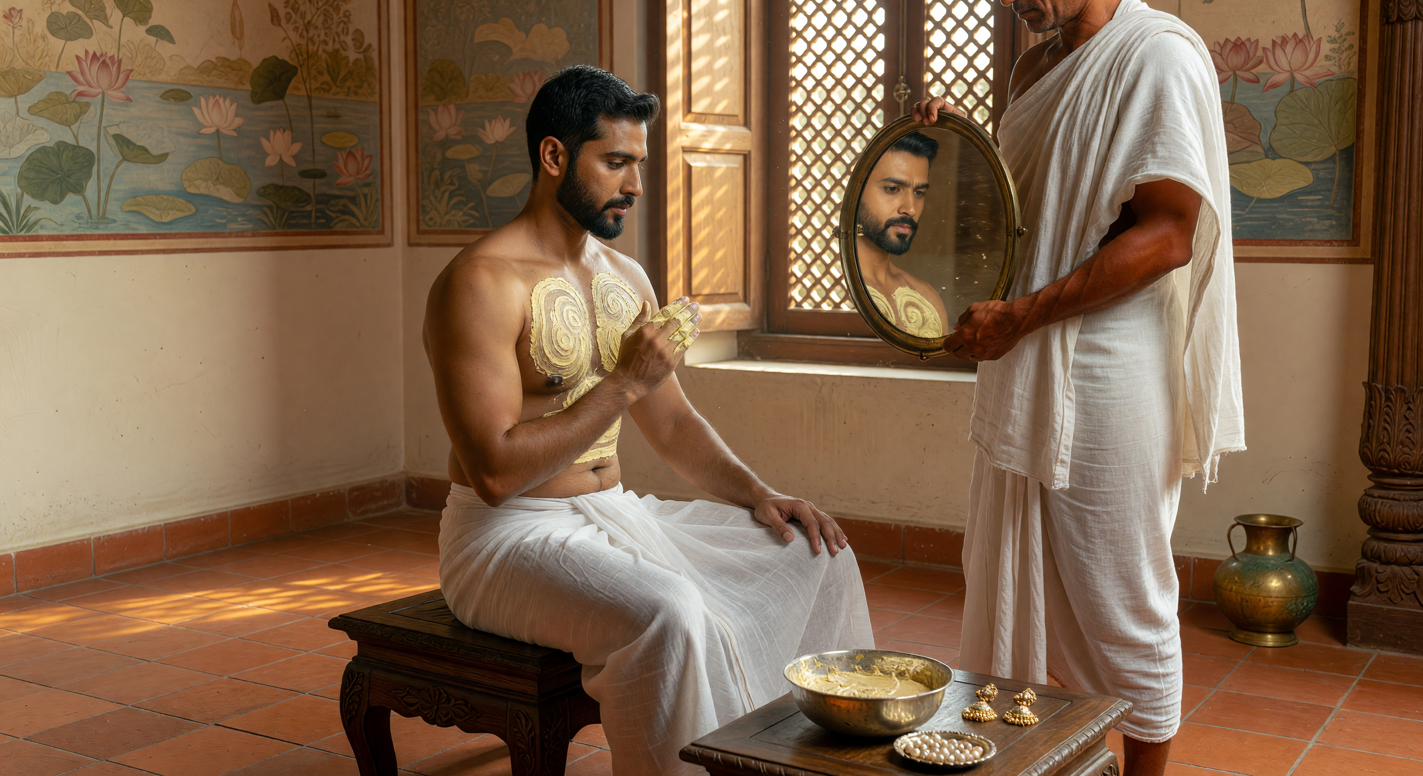 The image depicts a plausible elite grooming scene with a shirtless man applying yellow paste (likely sandalwood) to his chest, aided by an attendant holding a round bronze mirror, set in an opulent interior. Strengths include the white draped cotton garments (dhoti and uttariya) consistent with Gupta-era textiles, the bronze mirror as a verified luxury item from archaeological finds (e.g., at sites like Bhita and Taxila), and accessories like metal bowls and trays that fit late antique South Asian material culture. The yellow paste application aligns with textual descriptions in Kamasutra and medical texts like Sushruta Samhita for daily rituals using chandan (sandalwood). However, anachronisms mar accuracy: the mirror's reflection is overly sharp and modern (polished Gupta bronze mirrors had ~60-70% reflectivity, producing hazy images, not photorealistic ones); architecture features Mughal-inspired jali screens, lotus murals in a post-Gupta Pala-Sena style, and carved pillars evoking later temple aesthetics rather than 4th-century Pataliputra's simpler brick-and-mud residences with terracotta reliefs; terracotta flooring and wooden furniture feel generically 'Indian historical' without Gupta specificity. No overt impossibilities in flora (lotus motifs are period-appropriate) or biology, but visual coherence leans stylized rather than archaeologically grounded.