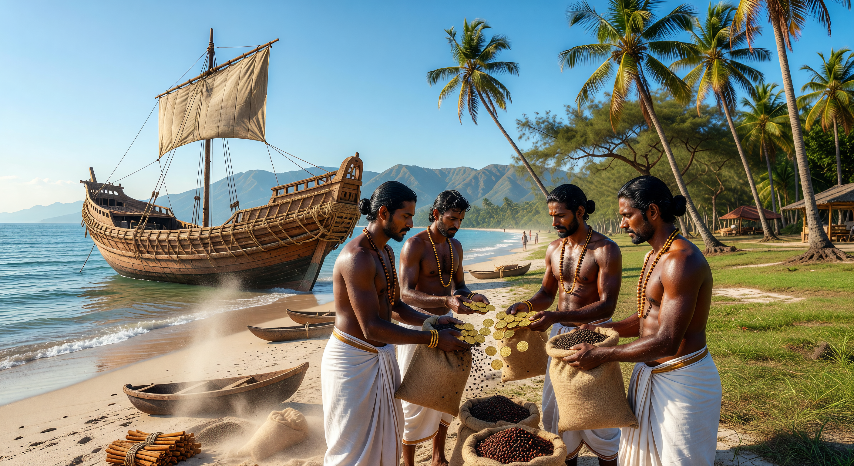 Paragraph 1: The committee broadly agrees the scene is plausibly set on a tropical South Indian coast and that the core trade concept is historically sensible: pepper is an appropriate commodity, Roman gold coin exchange is plausible, and the merchants’ bare-chested/dhoti-style attire and bead jewelry are at least broadly consistent with South Indian mercantile imagery. The shoreline, palms, sea, and mountainous coastal backdrop also fit the general Malabar/Indian Ocean setting.