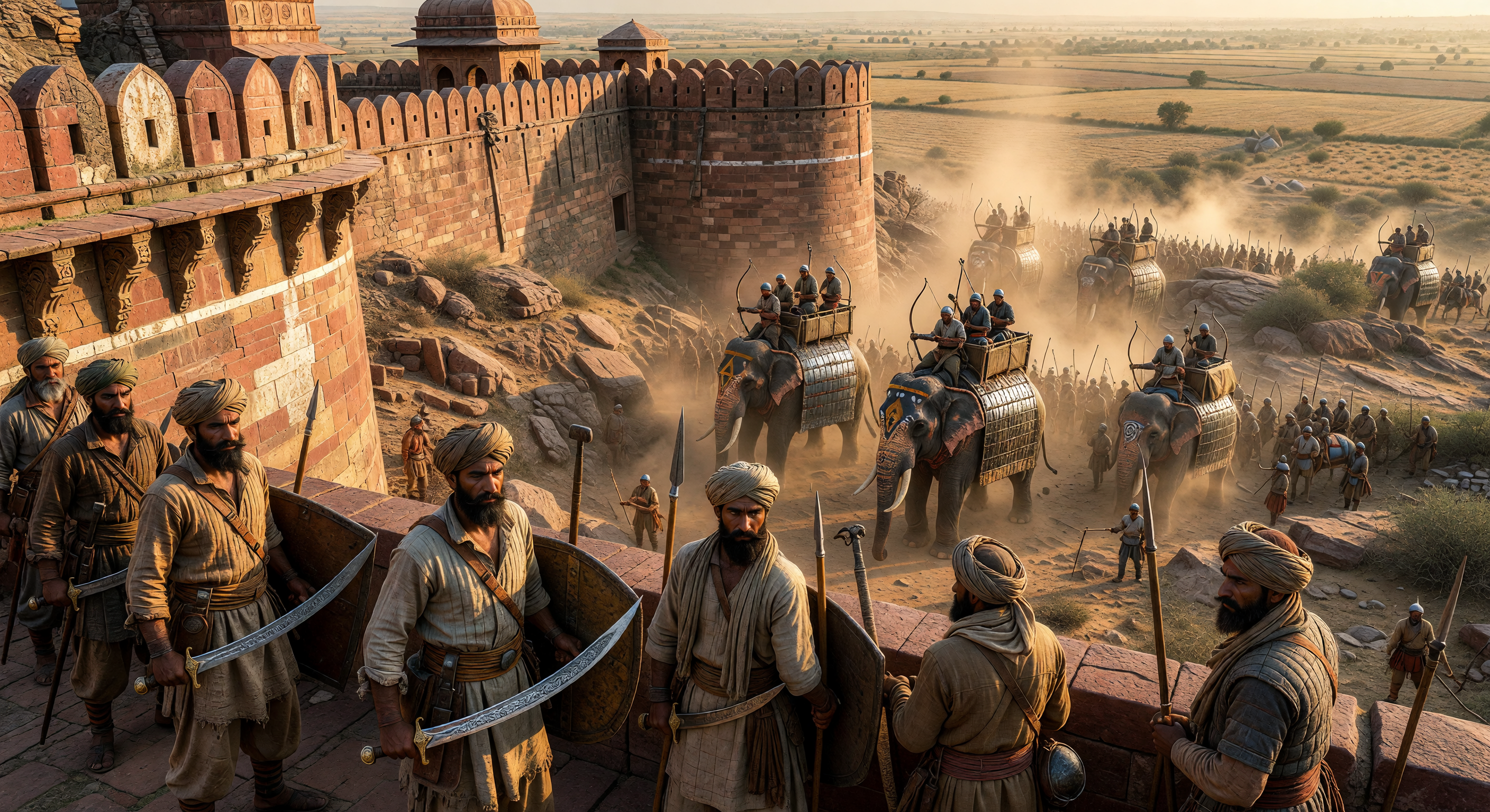 - 한국어: 라지푸트 언덕 요새 방어와 무장한 전투 코끼리
