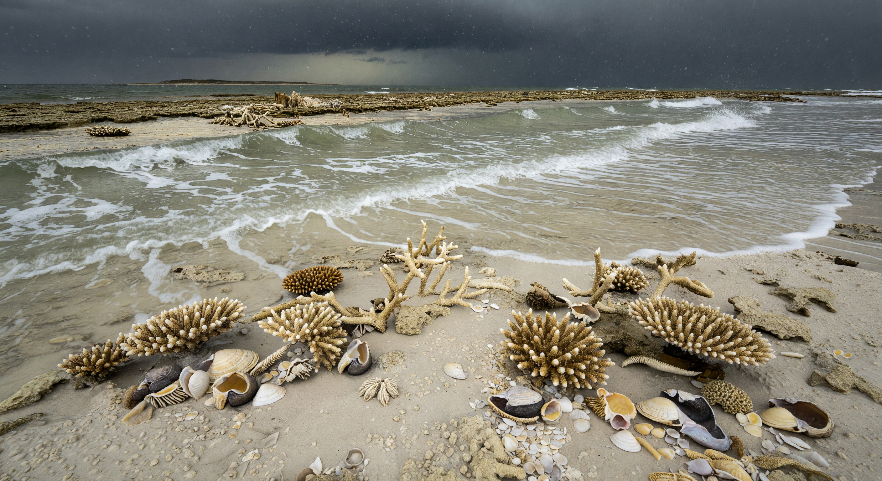 Paragraph 2: IMAGE issues identified by the committee: 1) The coral forms are anachronistic and too modern-looking, strongly resembling Cenozoic/modern branching reef corals such as Acropora, Pocillopora, or Stylophora rather than Jurassic taxa. 2) The specific Jurassic coral intended by the caption, Thecosmilia, is not convincingly represented; the visible colonies do not match its expected Jurassic morphology and instead look like delicate arborescent branching corals. 3) The shell debris is generic and modern-looking; it does not clearly read as Gryphaea or Trigonia. 4) No clearly identifiable belemnite guards are visible. 5) No clearly identifiable crinoid fragments/ossicles are visible. 6) The ooid sand / oolitic shoal texture is weak or absent; the substrate reads more like generic beach sand than rippled ooid carbonate sand. 7) The image does not strongly communicate a tropical storm specifically; it reads more like generic storm surf, with no strong cyclone-specific cues. 8) The committee noted the debris field lacks the diagnostic fossils and sedimentary textures needed for a credible Jurassic paleo-reconstruction, making the biota and sedimentation scientifically unreliable as depicted.