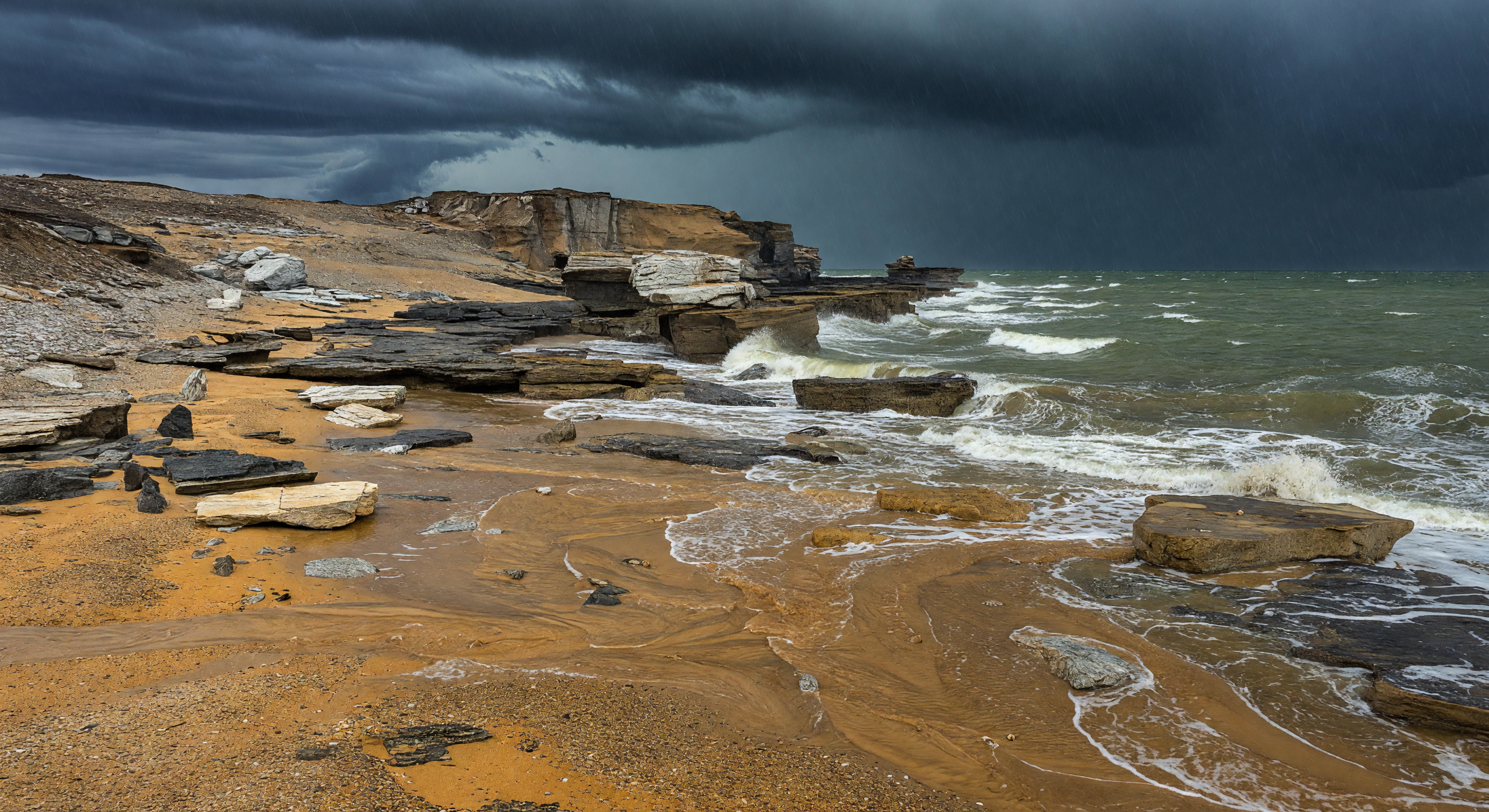 - العربية: جريان العاصفة على شاطئ لورينتيا الكامبري الخالي من الحياة
