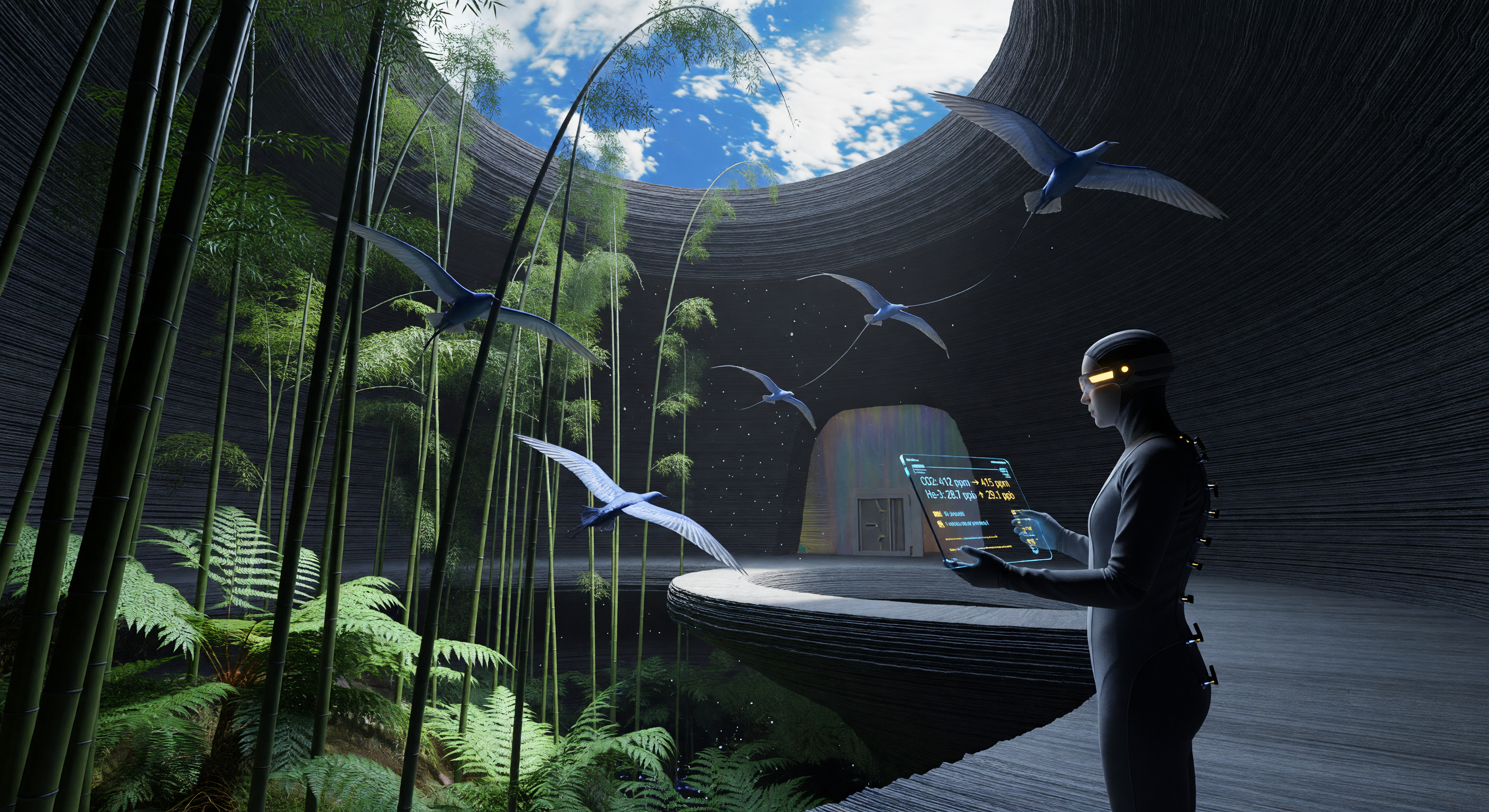 For the IMAGE, the committee identified these issues: 1. The most serious error is the apparent open skylight showing a bright blue Earth-like sky with white clouds; on the Moon this is physically impossible and makes the habitat look open to a terrestrial atmosphere rather than enclosed. 2. The image fails to clearly communicate a sealed, pressurized habitat envelope, despite the concept requiring one for humans, plants, and birds. 3. The depicted 'sky-ceiling' does not read as artificial; if it is meant to be projected or LED-simulated, it needs explicit visual cues such as panel seams, projection structure, dome framing, segmentation, grid texture, support members, or other enclosure indicators. 4. The birds appear to fly seamlessly through both the bright sky area and darker tube interior, which further obscures any boundary between enclosure and projected ceiling. 5. The atmosphere/flight conditions are under-specified visually; free-flying birds are only plausible if the chamber is clearly shown as pressurized with deliberate atmospheric engineering, which the image currently does not sufficiently indicate. 6. The human figure does not clearly show the captioned 'elongated limbs characteristic of lunar-native physiology'; the body reads as normal or only mildly stylized, not decisively adapted. 7. The ocular device is not clearly distinguishable as an implanted or significant 'ocular shunt'; visually it reads closer to advanced AR eyewear. 8. The holographic display includes CO2 around 412 ppm, which reviewers flagged as likely placeholder/Earth-normal rather than a carefully considered managed bioregenerative habitat value. 9. More explicit life-support/environmental-control infrastructure would improve plausibility, since the current scene under-shows the engineering needed for pressure, lighting, circulation, and ecological support in a lunar lava tube.