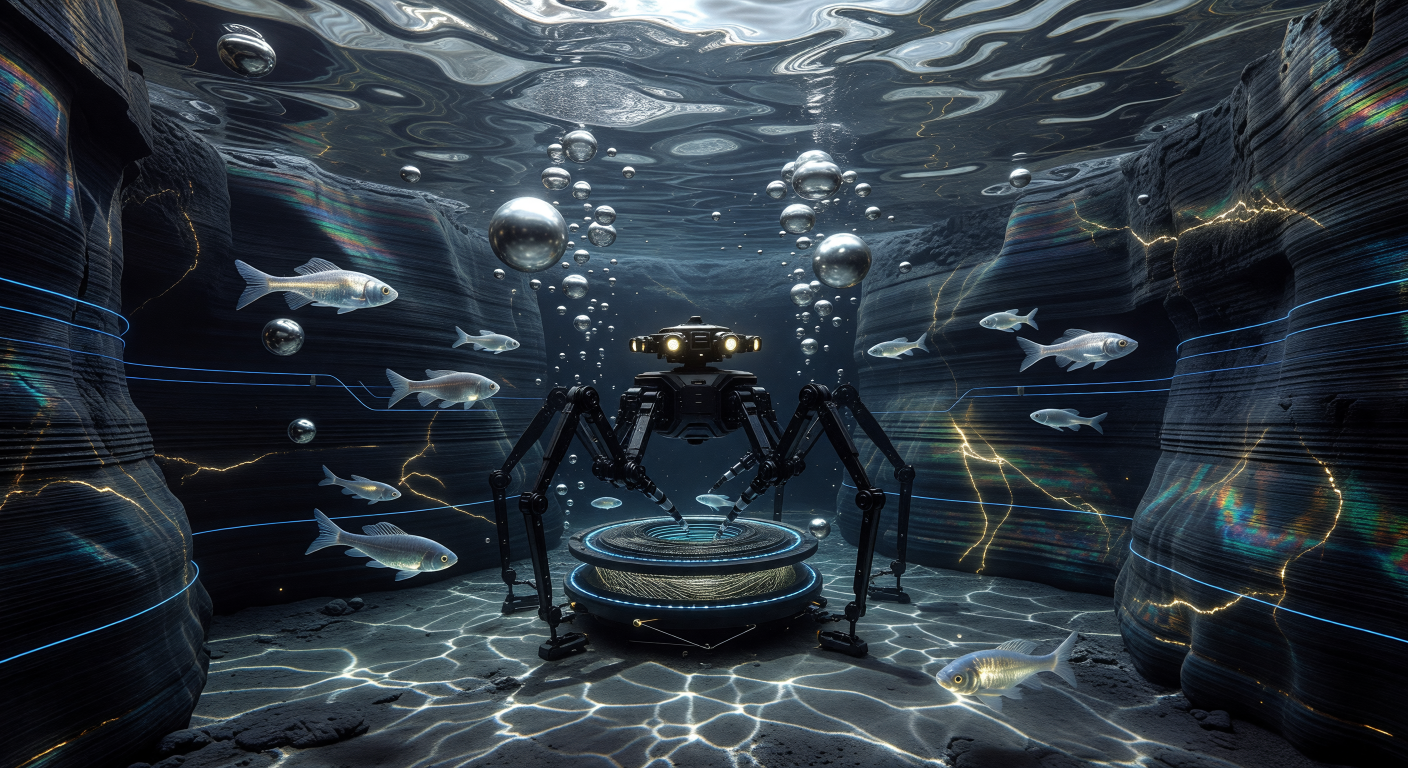 この画像は視覚的に非常に印象的であり、中核となる概念を効果的に伝えている。すなわち、玄武岩で内張りされた空間内で水中活動を行う六脚ロボットが、半透明の魚と大きく浮遊する気泡に囲まれているという構図である。マリウス丘の溶岩チューブは、月面居住地の候補として実際に科学的議論が最も活発な場所の一つであり、層状の暗い岩壁は玄武岩質地質の様式化された表現として妥当である。ロボットの設計は適切に非人型かつ工業的であり、六脚フレームはキャプションの記述ともよく一致している。魚は十分に半透明で銀白色に見え、人工改変ティラピアと整合的であるが、キャプションで述べられている生物発光は見られない。自発的に発光しているというより、受動的に照らされているように見える。