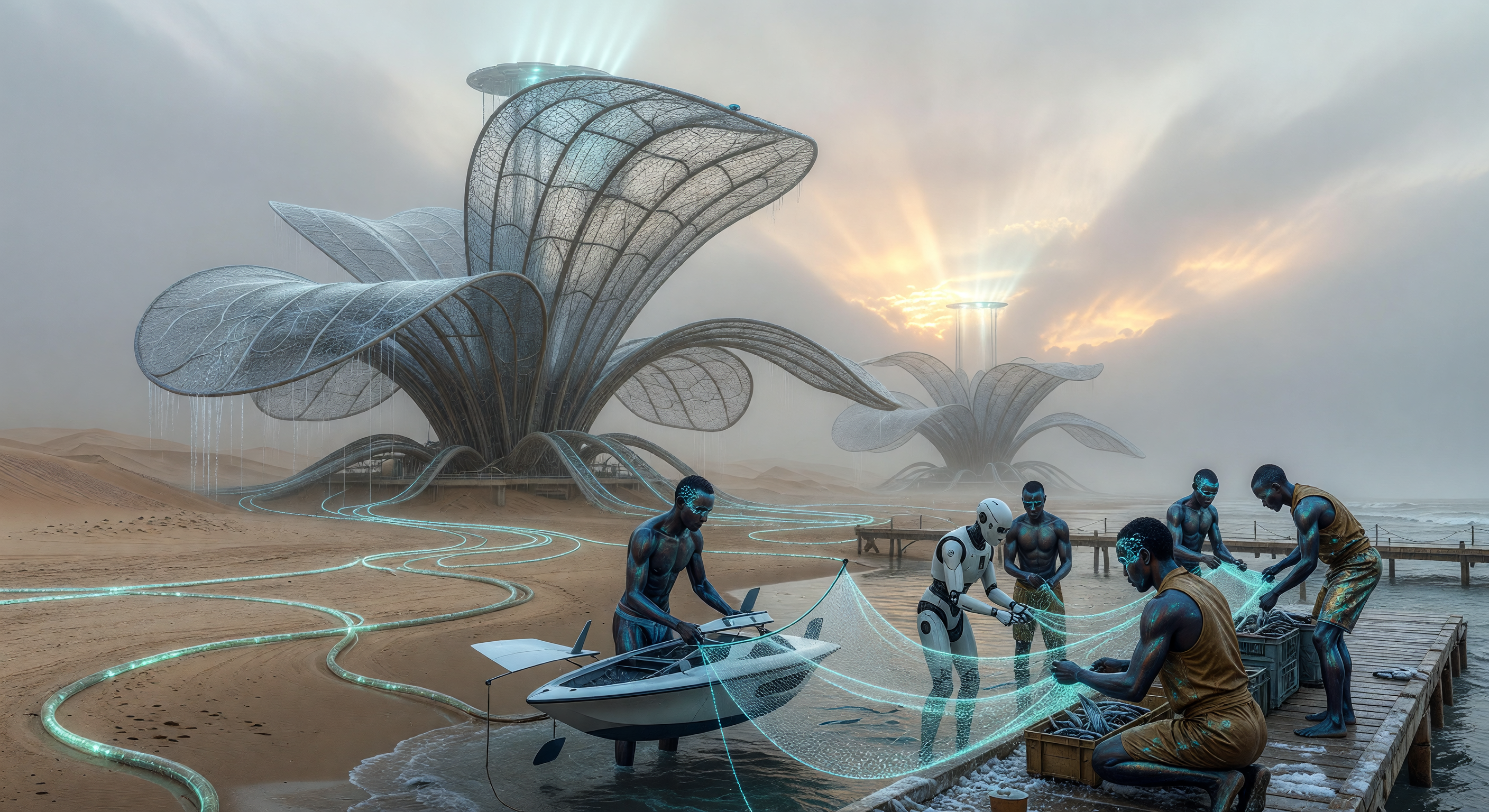 この画像は、この思弁的シナリオの精神を効果的に捉えている。霧、砂丘、大西洋岸線を備えたナミビアの沿岸環境は、地理学的にも気候学的にも適切である。バイオミメティックな構造物は視覚的に印象的であり、Welwitschia mirabilis の葉の形態を確かに想起させる。これはナミビアに真に固有の植物であり、強力で文化的な響きをもつデザイン上の選択である。三分的な社会構造も明確に描かれている。すなわち、白い身体をもつロボット(Synthetic)、発光する皮膚をもつ人物群(Augmented)、そして右側にいる衣服を着た非拡張の人物と思われる存在(Natural)である。構造物の葉状表面から滴る水は、フォグハーベスティングへの巧みな視覚的言及となっている。これはスケルトン・コースト沿いで実際に見られる現象であり、ナミブの霧は測定可能な水分をもたらす。小型の水上艇も、フォイル形状は曖昧ではあるが、電動ハイドロフォイルである可能性は十分にある。全体としての構図は視覚的に整合しており、思弁的ワールドビルディングとして説得力がある。